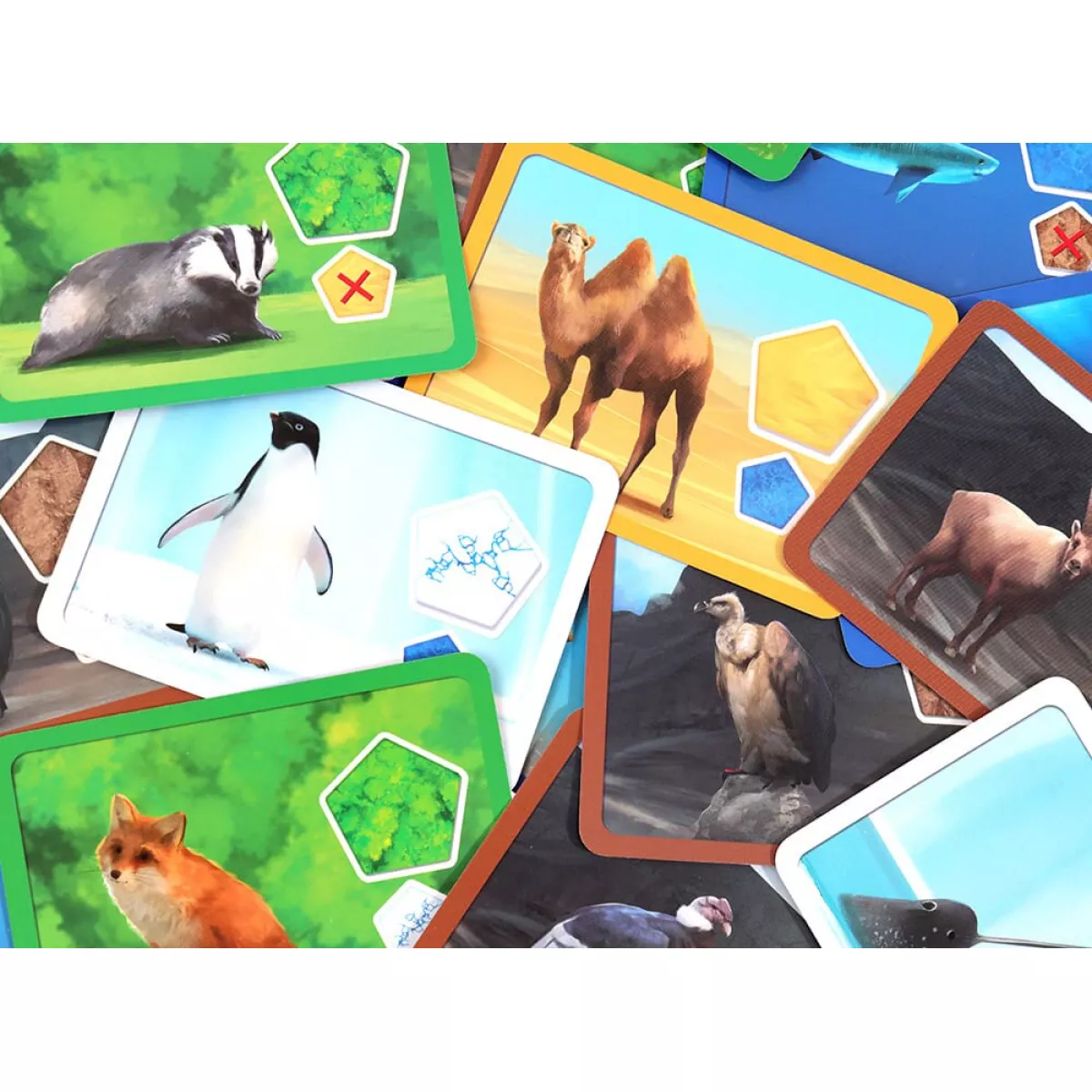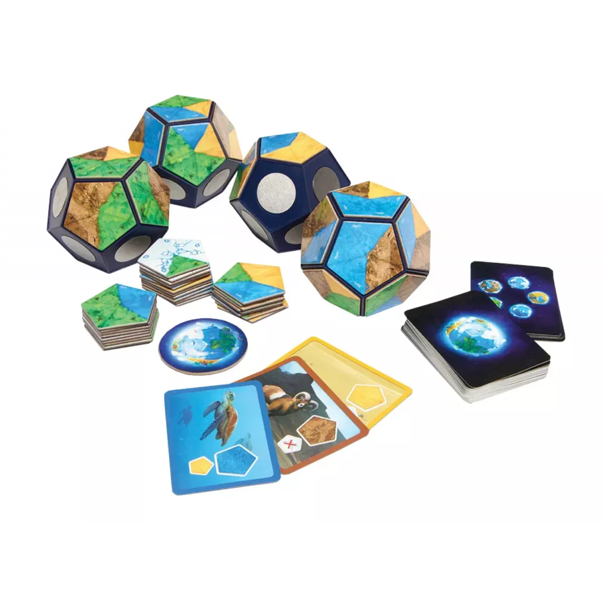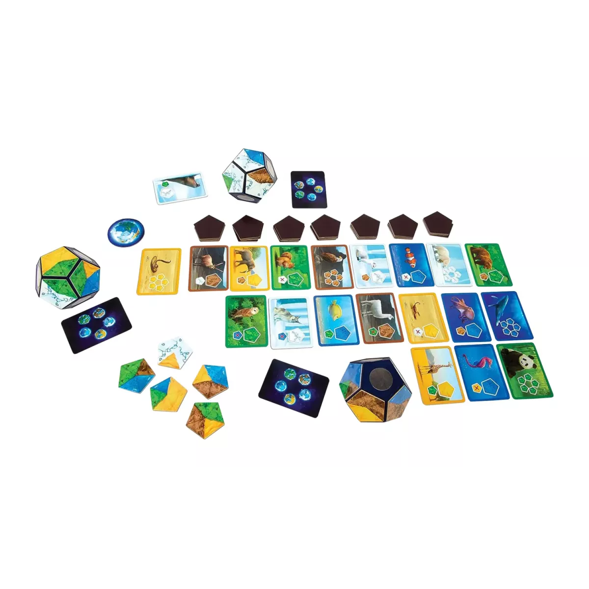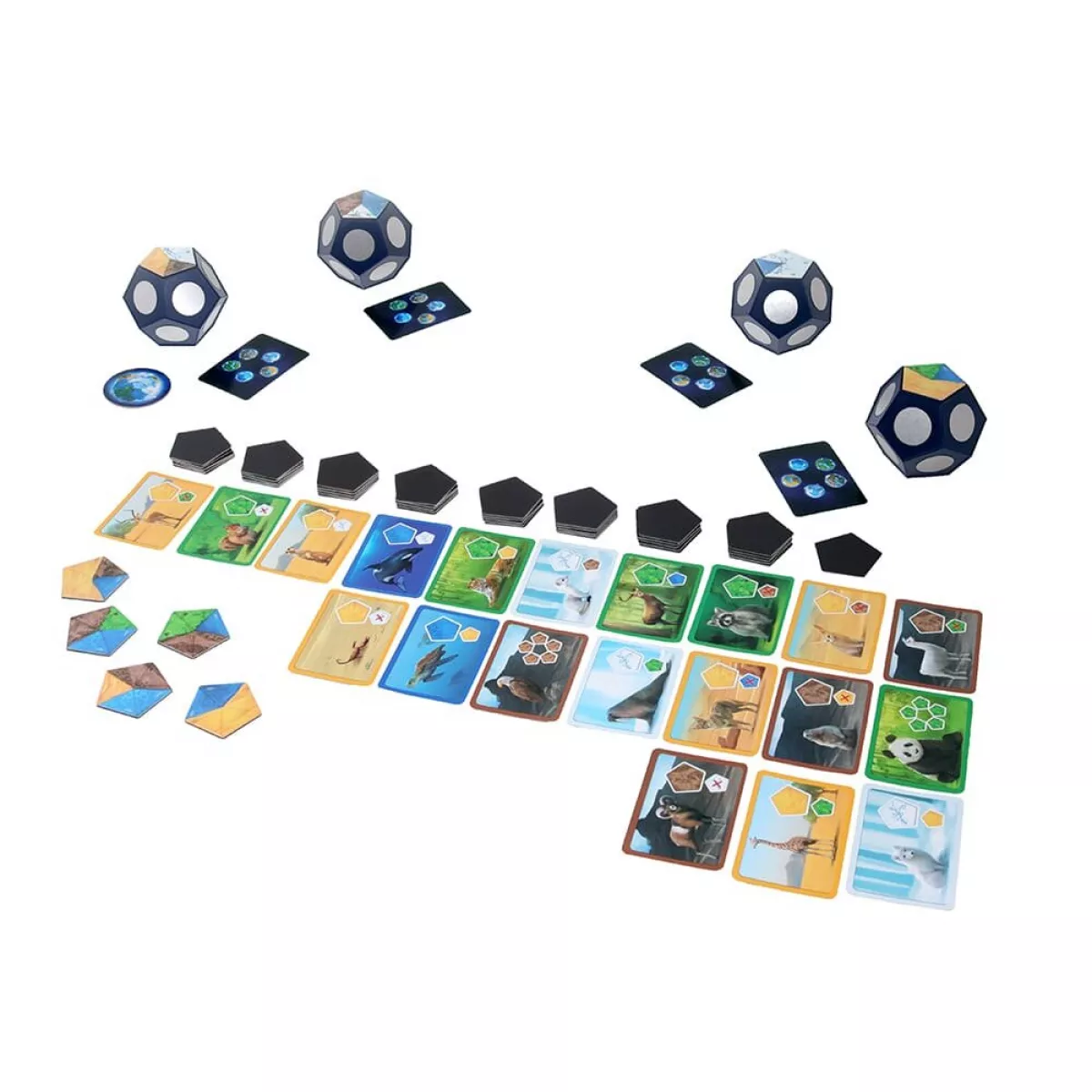 У коробці 4 основи планет, 50 тайлів континентів, 45 карт з тваринами, 5 карт цілей «природного середовища існування», жетон першого гравця, правила гри