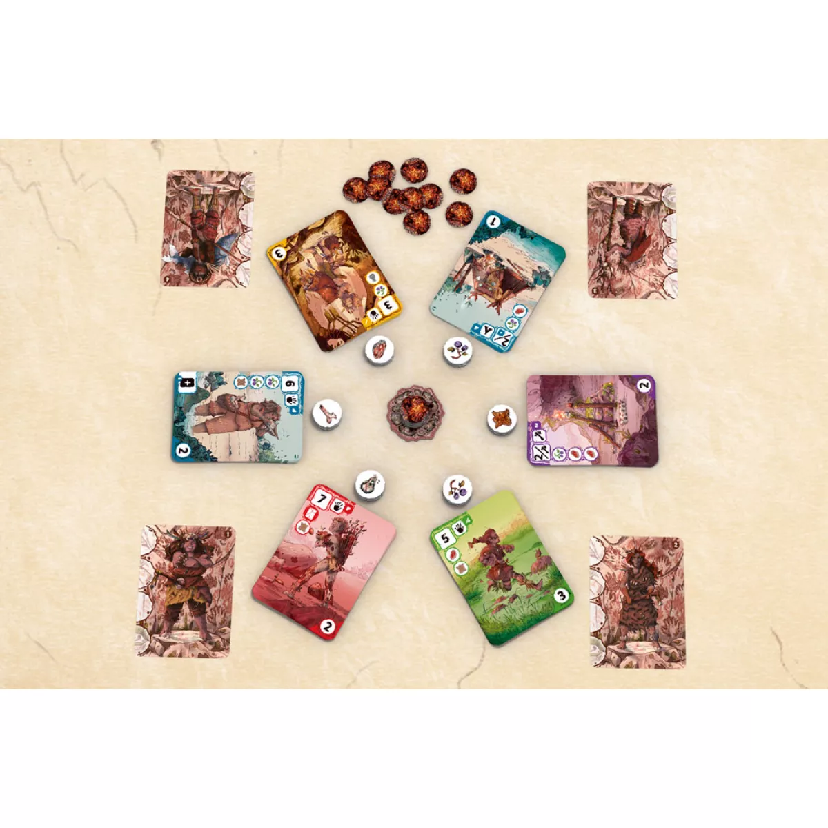 Повільно догоряє багаття, а вечірні тіні стають все довші. Це означає, що у Вождів залишилось зовсім мало часу, аби підготувати своє плем’я до ще однієї ночівлі. Добре, що карткова гра для 2-4 гравців займає лише 30 хвилин і ви точно впораєтесь з тим, аби жодні небезпеки не потурбували сон ваших співплемінників. Ягоди, м’ясо та кістки, - що ще потрібно сучасному племені? У свій хід гравець виконує різні дії для покращення та розбудови свого племені. Для цього треба спершу обрати карту з одного з шести стосів у центрі столу, взяти її собі на руку, а потім ще й отримати ресурси у кількості, вказаній на карті. Ці ресурси також  у випадковому порядку викладені у 6 стосів, тож часом, аби дістатися потрібного шматка м’яса, доведеться взяти на руку й не дуже корисну карту. Тепер можна розігрувати карти з руки, сплативши їх вартість у вигляді ресурсів (можете не переживати за те, що ягоди хотілося б піднакопичити на щось грандіозне, холодильників у ті часи ще не винайшли, тож наприкінці ходу можна мати лише 4 предмети, а в ускладненому режимі - взагалі 3). Ну і яка користь з цих «колес», які ви винайшли? У нас ще нема МакДрайву, нам немає куди їздити! Всі розіграні карти тим чи іншим чином принесуть переможні очки. Деякі - самі по собі, іншим - доведеться ще трішки допомогти, до прикладу, кожна гілочка з ягодами на цій карті принесе користь наприкінці гри. Ба більше, деякі з карт мають ще й потужний одноразовий ефект, який треба використати у слушний час, аби отримати перевагу. І от, як тільки ресурси біля багаття закінчаться, варто збиратися на заслужений відпочинок. Звичайно, перед цим треба порахувати всі переможні очки, аби визначити хто з вождів найкраще підготував своє плем’я! Тож якщо вам до смаку швидкі карткові ігри на збір комбінацій, ви не хочете годинами вивчати стоси правил, а бажаєте просто сісти і почати грати, то захоплююча настілочка Плем’я без сумніву стане вам до смаку! Та для більш суворого виживання серед доісторичних снігів Північної Америки оберіть велику економічну стратегію Нескінченна зима. Палеоамериканці, різноманітність та варіативність якої зроблять незабутніми ваші багатогодинні партії у цій грі.