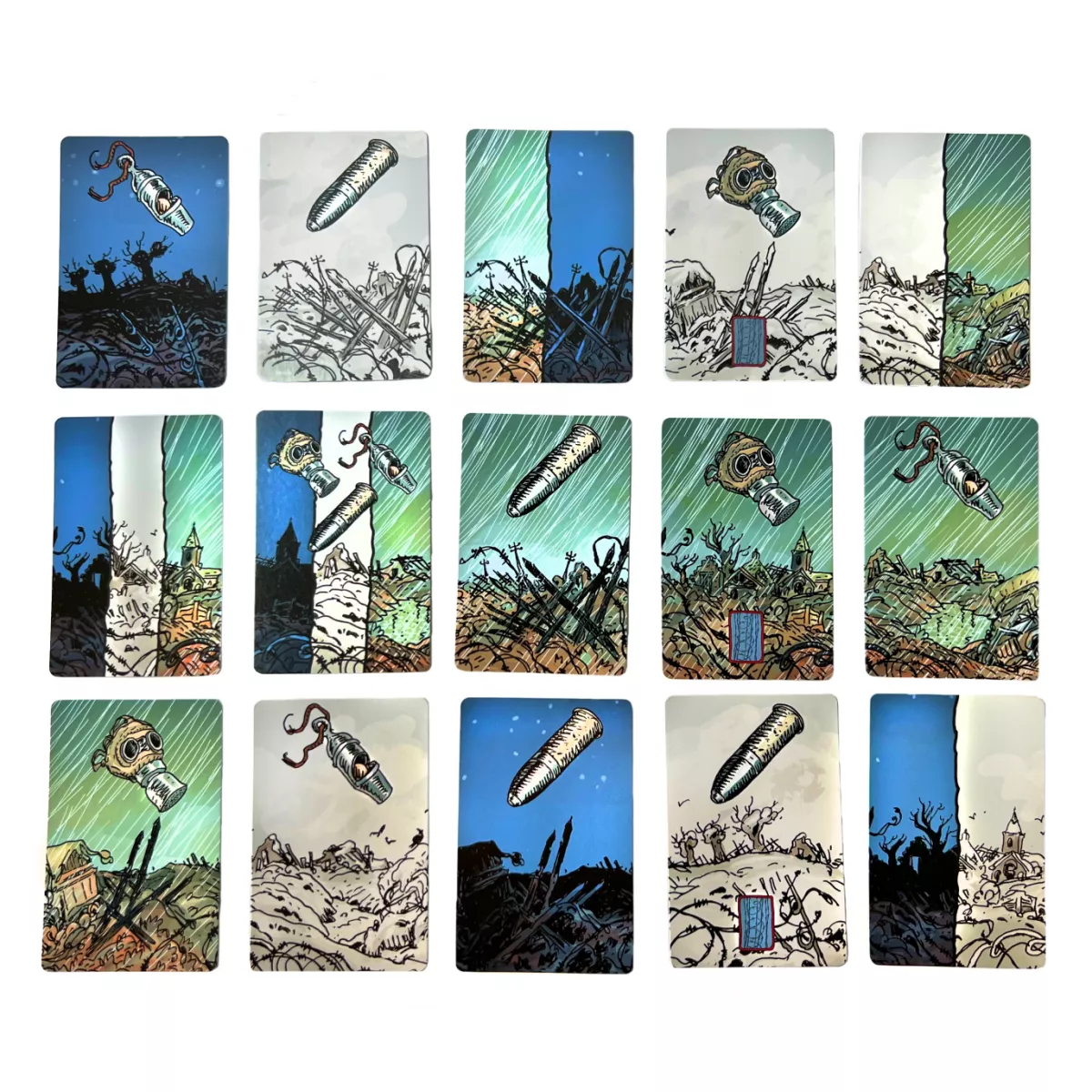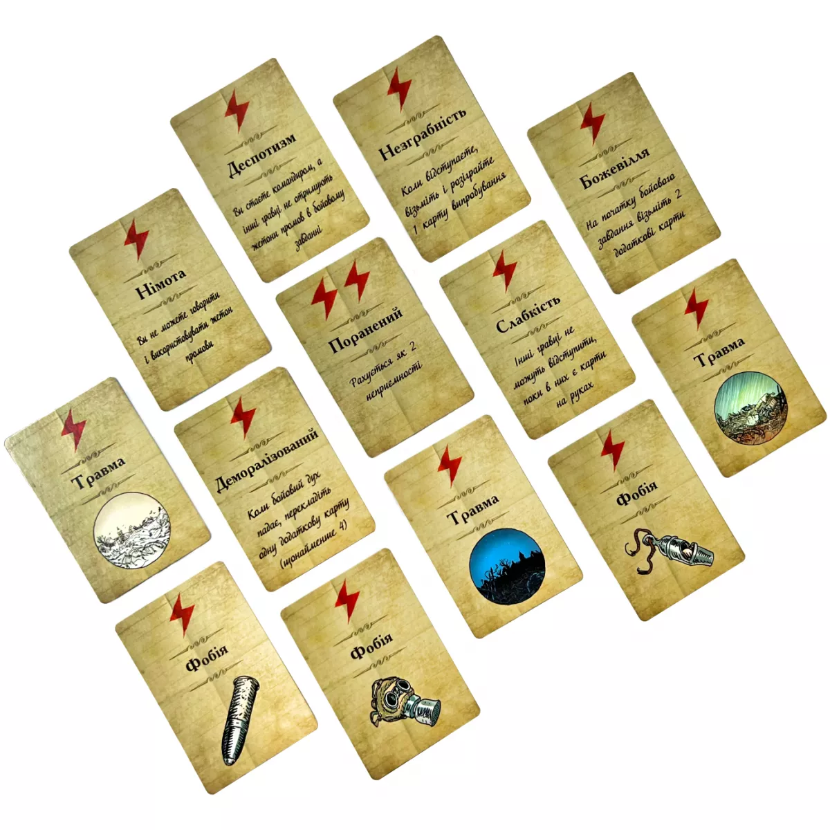 Випробування бувають двох видів – загрози та фобії-неприємності. Загалом існує шість типів загроз – ніч, дощ, сніг, обстріл, атака за свистком і газова атака. На одній карті може бути кілька загроз. Карти загроз викладаються в центрі столу, а неприємності – безпосередньо перед гравцями.