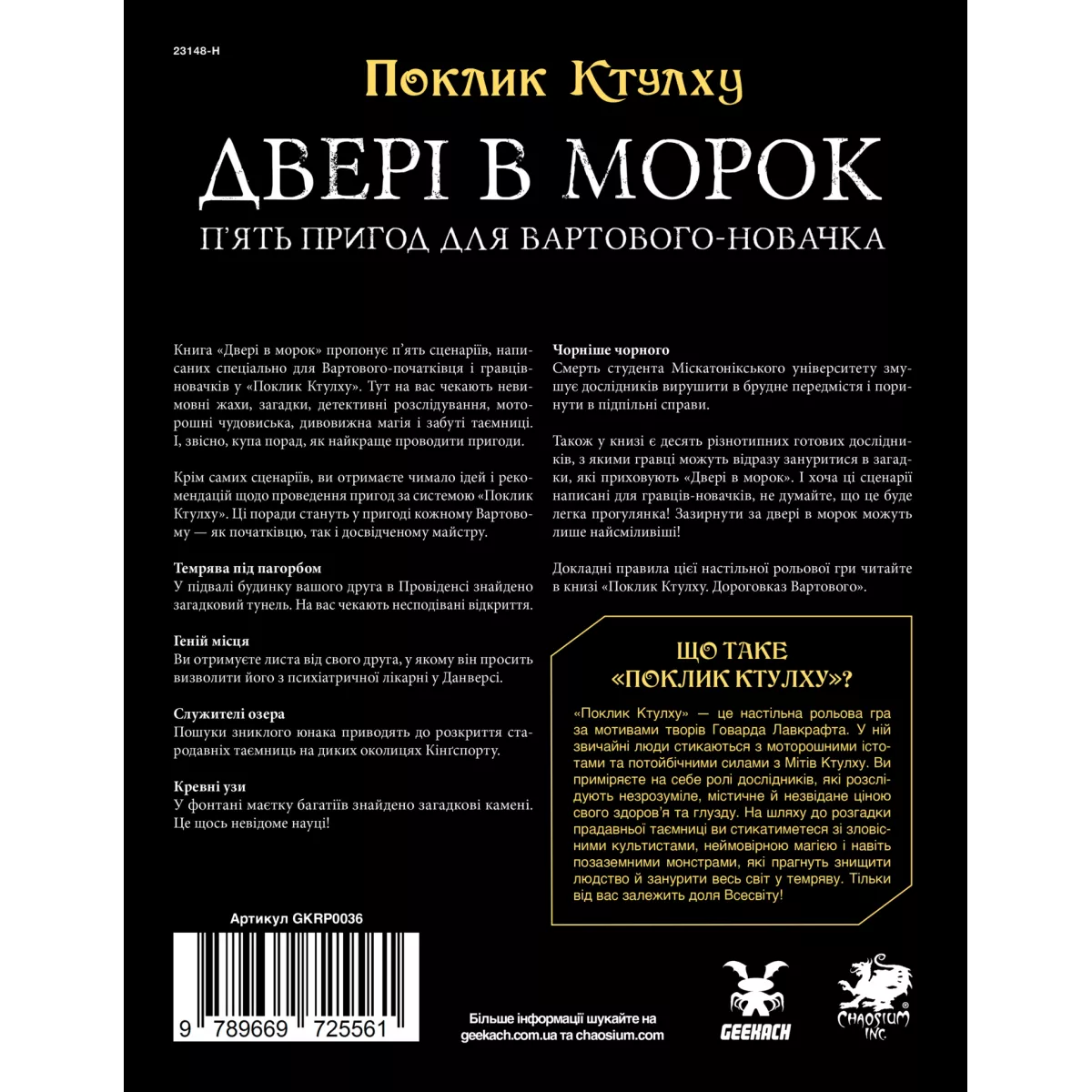 «Поклик Ктулху. Двері в морок» — це книга, що містить п’ять легендарних ознайомчих пригод для настільної рольової гри «Поклик Ктулху» в класичному сетингу Країни Лавкрафта 1920-х років. Пригоди призначені для початківців — як Вартового, так і гравців, а втім, не сподівайтеся на безтурботну прогулянку — відчиніть двері в морок і переконайтесь у цьому на власні очі!