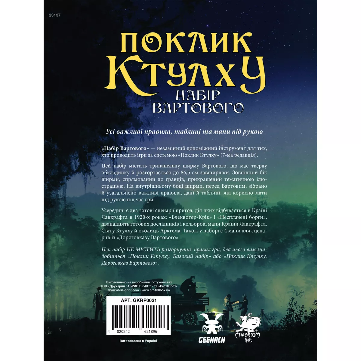 Перед вами набір Вартового для найсвіжішої — сьомої — редакції настільної рольової гри «Поклик Ктулху». Набір містить усі найважливіші допоміжні матеріали для майстра гри, якого в цій НРГ називають Вартовим Потаємного Знання, або ж просто Вартовим. Мапи, сценарії, готові дослідники та, що найголовніше, ширма стануть у пригоді під час проведення ігор і зроблять процес значно приємнішим для Вартового й дослідників.