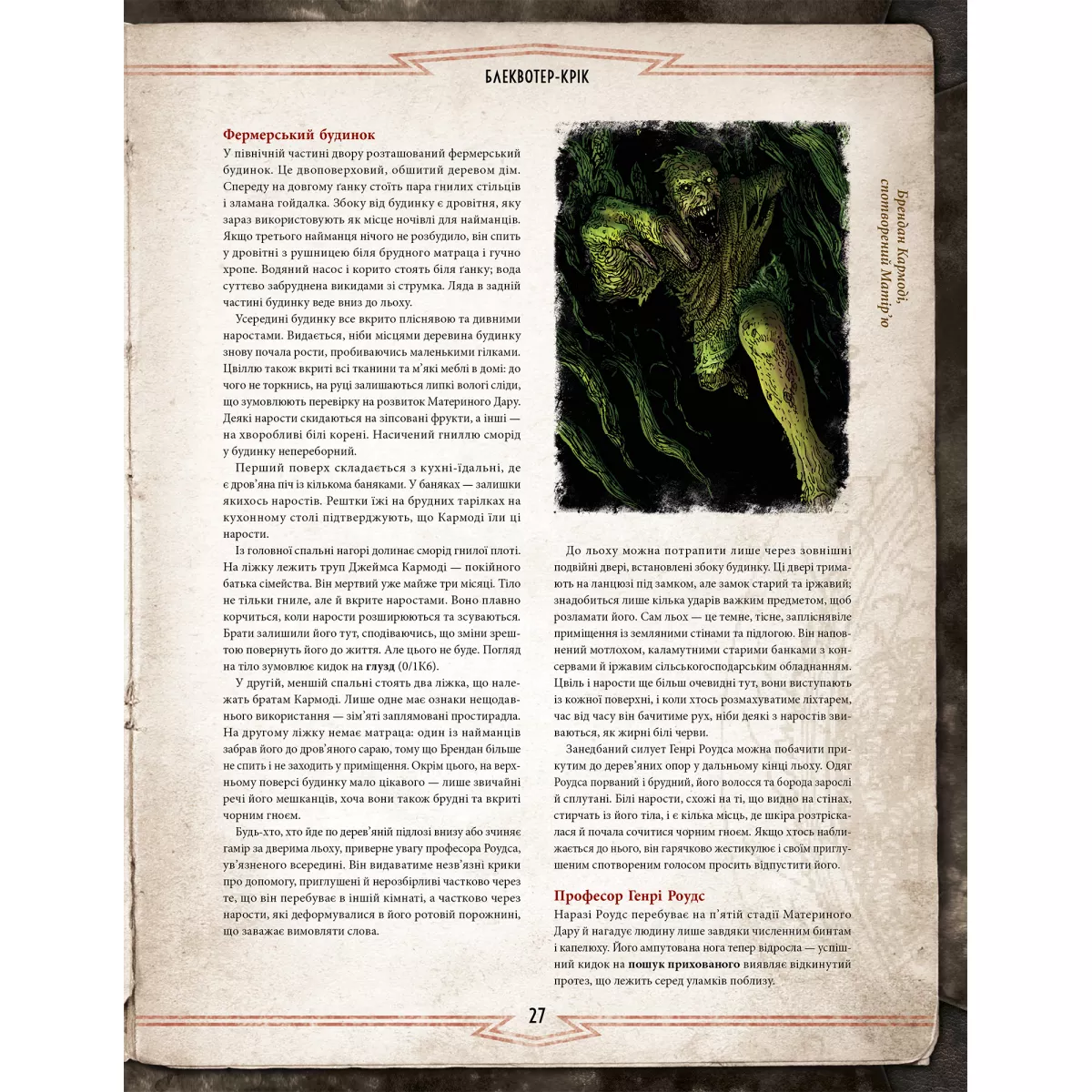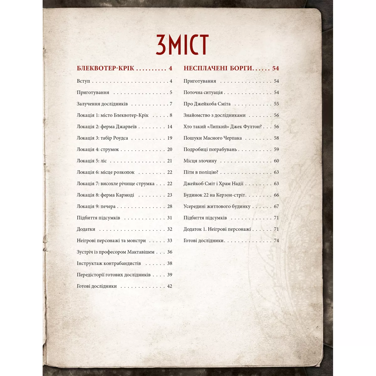 Пригоди. Два готові сценарії пригод — «Несплачені борги» та «Блеквотер-Крік», події яких розгортаються в класичному сетингу Країни Лавкрафта 1920-х років.