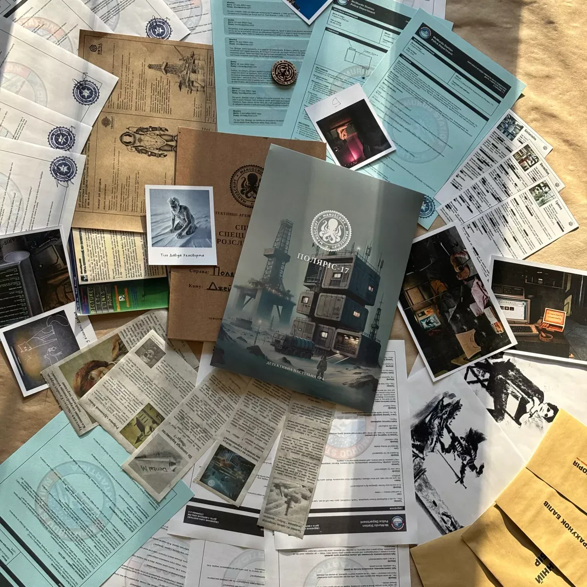 У коробці Обкладинка, Тека, Інструкція / комплектація, Протоколи, досьє та інші документи, 4 конверти з інформацією, Покази свідків, Фотографії, Креслення, Малюнки, Газети, Ігровий сувенір, Підказки