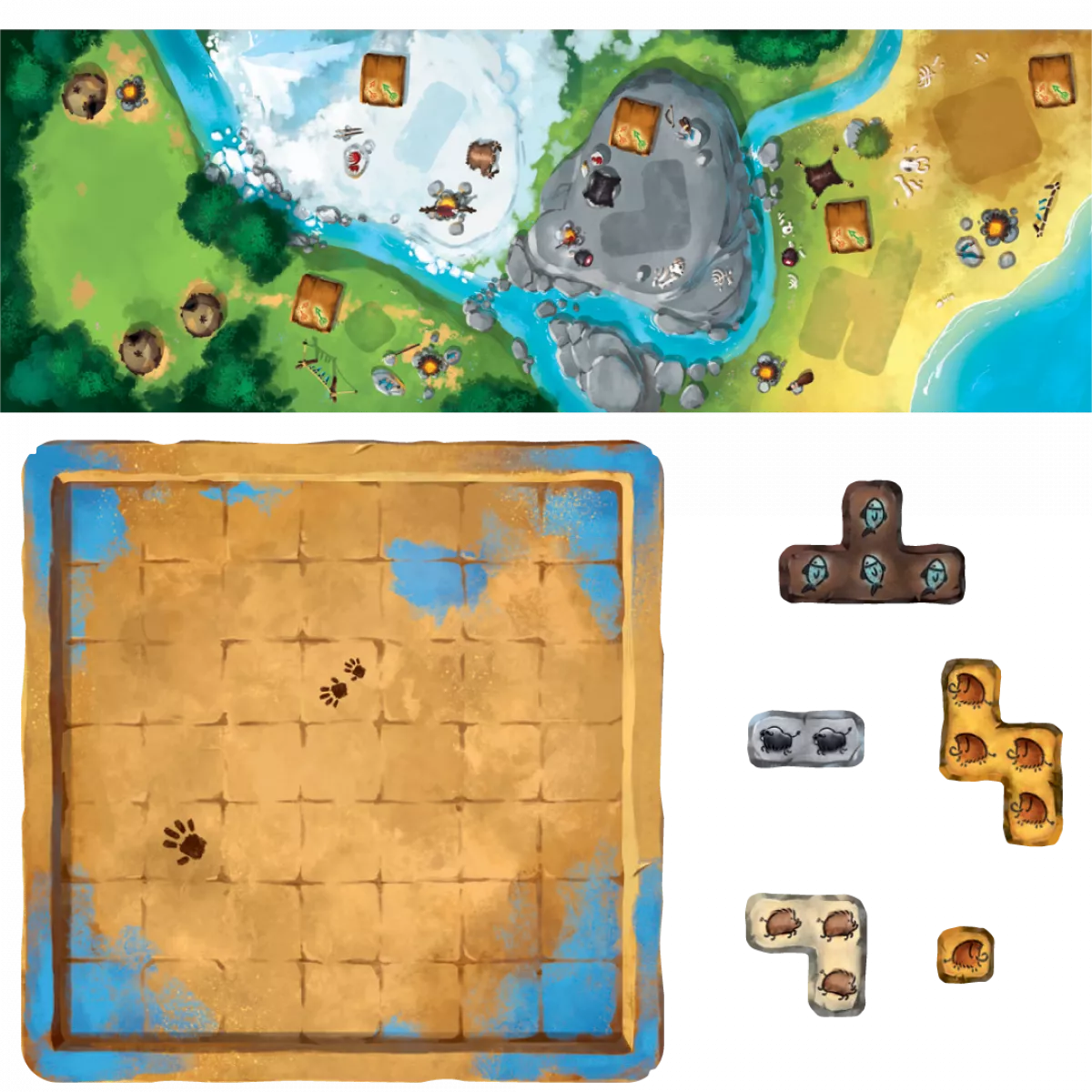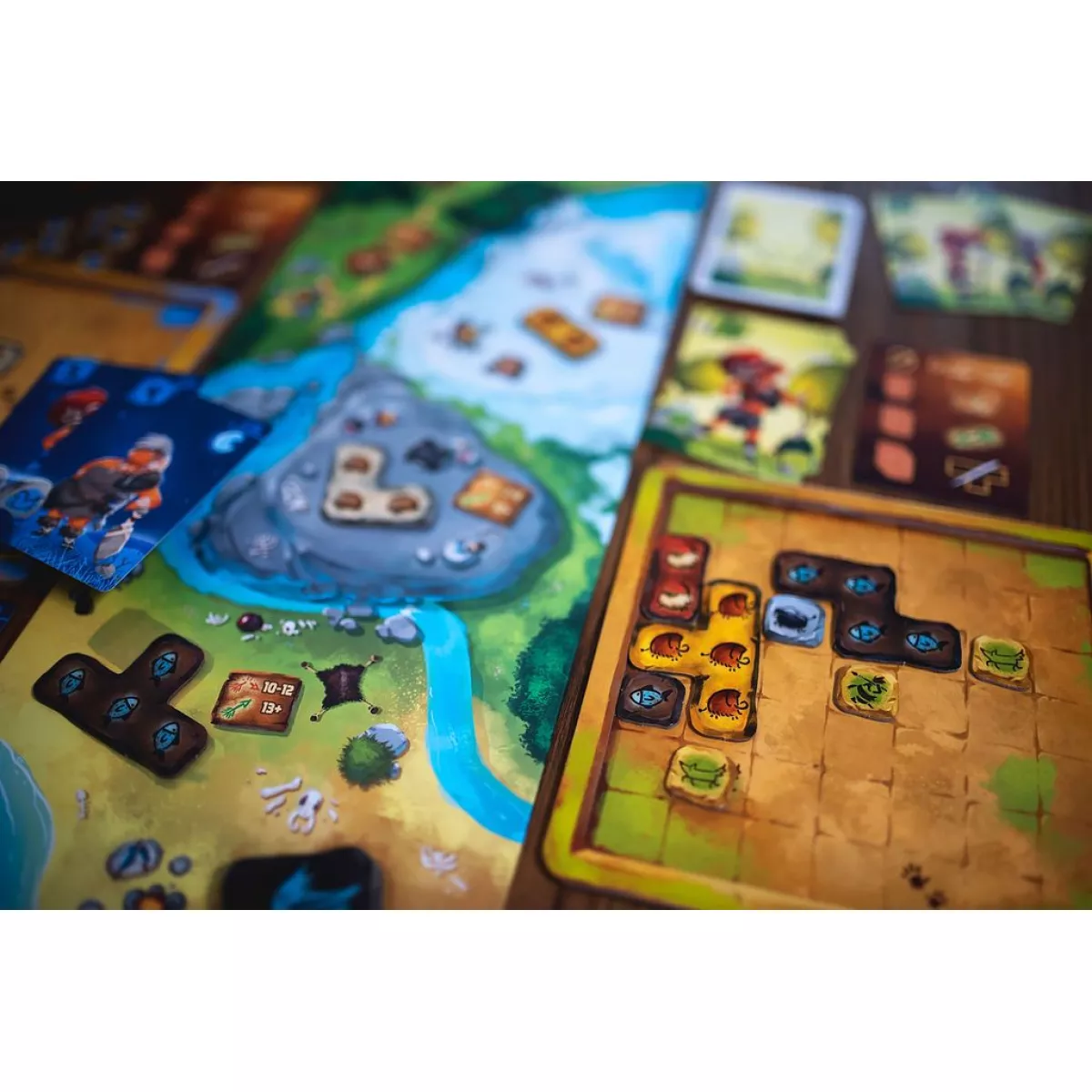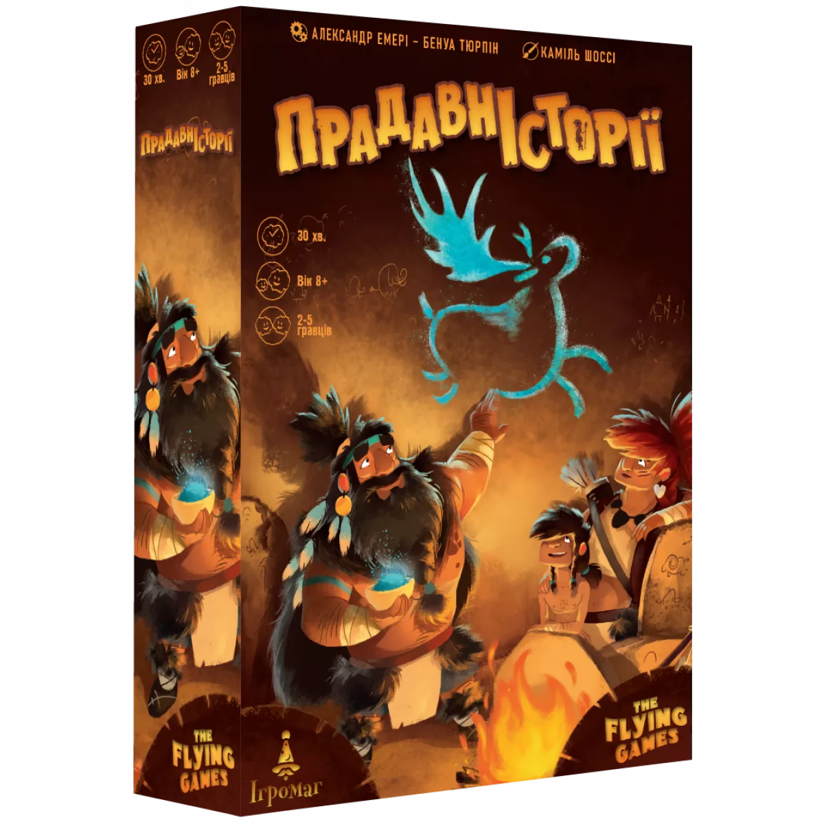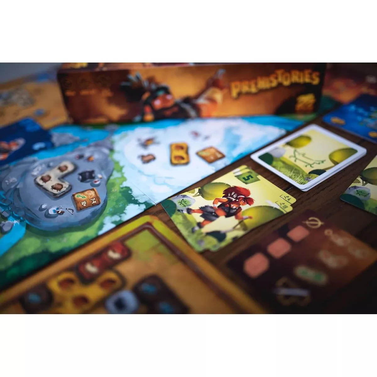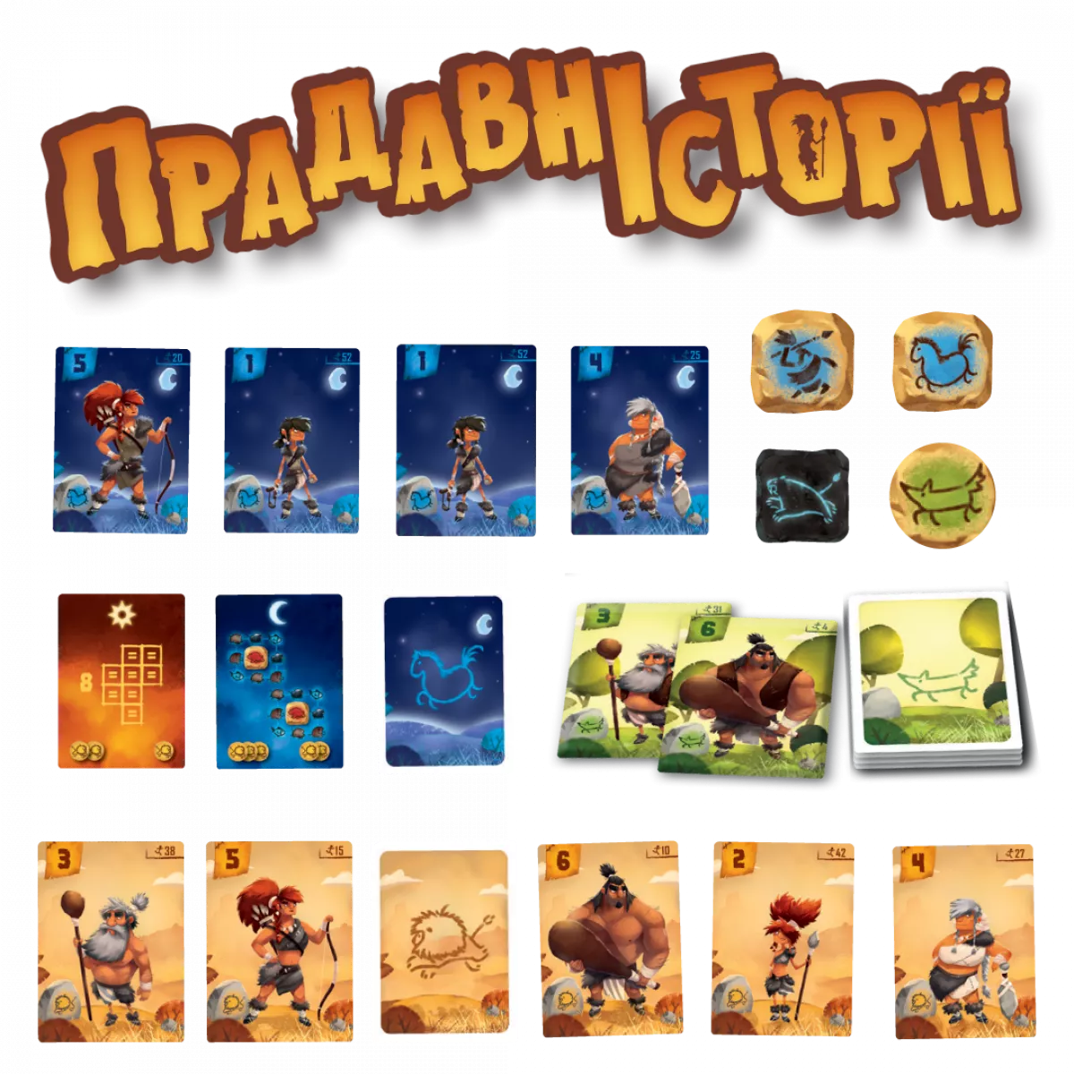 Ви лідер доісторичного племені, який вирішує, хто з членів вашого племені йде на полювання та яку здобич вони хочуть зловити. Щоб допомогти вам, Старійшини створили завдання, які ви можете виконати, малюючи на стіні своєї печери. У кожному раунді гри Прадавні Історії (Prehistories) ви та вожді ваших одноплеменників одночасно (і таємно) берете участь у торгах, щоб вирішити, хто де полює. Чим більше у вас мисливців, тим більшу дичину ви можете зловити, але тим повільніші ви стаєте. Найшвидший гравець — тобто той, у кого найменша сума мисливців — йде першим, але у нього небагато мисливців, з якими можна полювати. Щоб полювати, ви призначаєте своїх мисливців до одного або кількох місць, щоб зловити здобич, яка там чекає. Здобич представлена плитками поліоміно, і чим більша плитка, тим більша сума потрібна. Якщо у вас достатньо мисливців, щоб зловити вашу здобич, вони можуть бути поранені в процесі, а це означає, що ви візьмете менше карт мисливців наприкінці раунду, щоб поповнити свою руку. (Вони не довіряють вашому керівництву, коли ви їх травмуєте!) У другій фазі раунду ви розфарбовуєте свою печеру плитками тварин, зібраними під час фази полювання. Ваша печера представлена сіткою 7x7, яка починається з кількох плиток, які вже є на місці. Перша плитка, яку ви розміщуєте, міститься в лівому стовпчику, а всі наступні плитки мають торкатися вже розміщених плиток, при цьому всі плитки мають бути орієнтовані так, щоб тварини дивилися з опущеними ногами (або плавниками). (Печерні люди мають прості смаки і хочуть, щоб усе було репрезентативним.) Коли ви виконуєте побажання Старійшин, розмальовуючи свою печеру певним чином — наприклад, завершуючи горизонтальну лінію, з’єднуючи протилежні кути або оточуючи легендарну тварину з усіх боків — ви розміщуєте один або кілька жетонів тотемів у цьому виклику. Перемагає той, хто першим скине свої вісім жетонів тотемів.