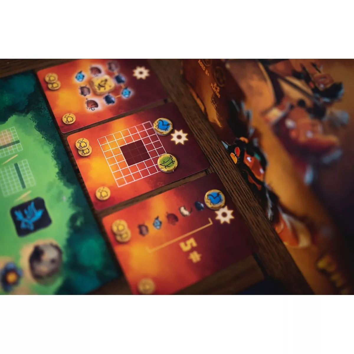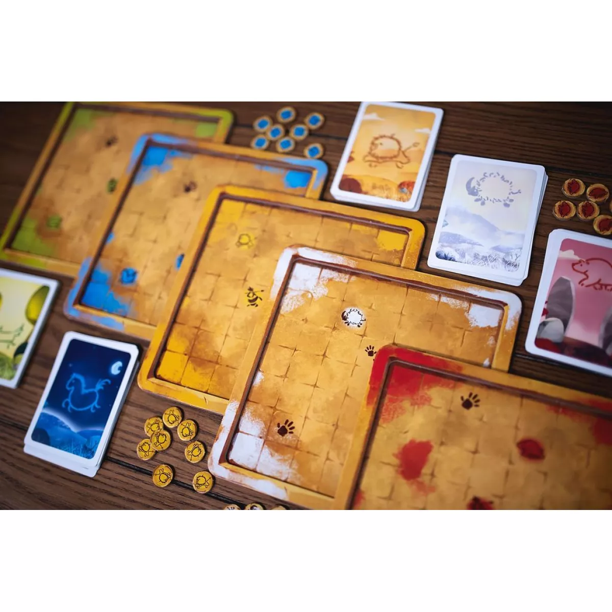 У коробці 5 наборів з 12 карт мисливців (силою від 1 до 6), 5 пам'яток, 25 тайлів звірів розміром 1, 25 тайлів звірів розміром 2, 10 тайлів звірів розміром 3, 10 тайлів звірів розміром 4, 5 тайлів легендарних звірів, 5 3D-печер, 40 токенів тотемів (по 8 на гравця), двобічне поле (на 2-3/4-5 гравців), 9 двобічних карт цілей (сонячний і місячний боки), прозорі наліпки