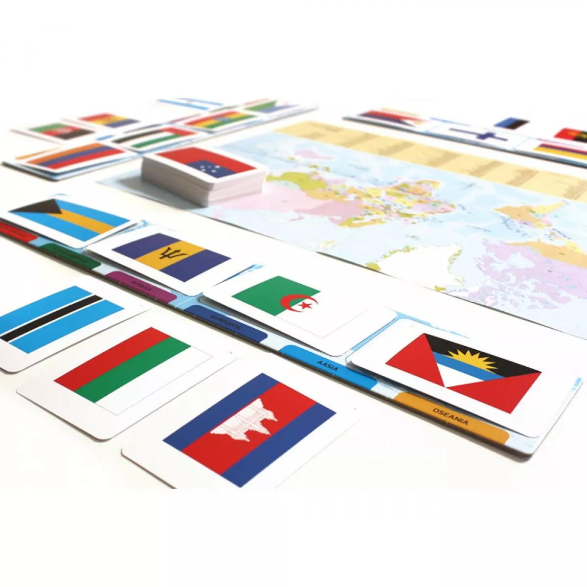 У коробці 200 карток з прапорами, 6 підставок з континентами карта світу, правила гри