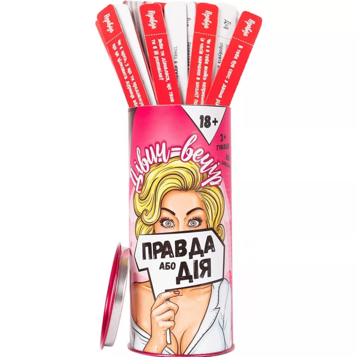 Правда або Дія: Дівич-вечір тільки починається! Стандартний сценарій всіх або майже всіх дівич-вечорів: кілька подруг, які давно не бачилися, кілька пляшок шампанського, кілька свіжих пліток, кілька старих, але все ще актуальних секретів і десятки пропущених дзвінків і непрочитаних смс на мобільних телефонах. А чим же зайнятися, коли вже обговорили життя, роботу, хлопців і їх близьких друзів? Чим би розбавити вечірку, щоб вона стала не схожою ні на один інший дівич-вечір? Та хоча б грою Правда або Дія: Дівич-вечір! І, ймовірно, після гри секретів у вашій компанії стане ще більше, але зберігати їх доведеться вже всім разом. Дівич-вечір у самому розпалі! Правила гри Вони досить прості, їх буде легко зрозуміти, навіть якщо ваш дівич-вечір триває вже не одну годину, а під столом стоїть не одна порожня пляшка з-під шампанського. Учасниці сидять в колі і по черзі задають один одному питання: «Правда або Дія?» Якщо ваша подруга вибирає «дію» - вона тягне з тубуса смужку, зачитує завдання з фіолетовою стороною і виконує його. Якщо вона вибирає «правду» - зачитується питання з червоною сторони стіку, на яке і потрібно дати відповідь. Питання трапляються різного характеру: від невинних до вельми відвертих. Вас можуть запитати, чи читали ви коли-небудь чужі листи або смс, а можуть попросити розповісти про самі екстремальні місця, де у вас був с*кс. Те ж саме стосується завдань: вас можуть попросити зробити Селфі на телефони всіх подружок, а можуть і попросити станцювати стриптиз. Придумуючи завдання і питання, автори подбали про те, щоб ваша вечірка пройшла на славу і вже точно запам'яталася всім учасницям. Вибираючи смужку із завданням, ви можете взяти одну і ту ж, якщо вже знаєте, що там за завдання і не боїтеся його виконати, але робити це можна не більше двох разів поспіль. Також ви можете відмовитися виконувати завдання або відповідати на питання, але тільки два рази, на третій інші учасниці придумають вам штрафне завдання, і вже його обов'язково доведеться виконати. Сьогодні дівчата відпочивають! Правда або Дія: Дівич-вечір В грі Правда або Дія: Дівич-вечір не ведеться підрахунок очок, не нараховуються переможні бали (хіба що можна придумати свої у вигляді шотів або коктейлів) і не визначається переможець. Веселе проведення часу і похмілля на наступний ранок - ось головне правило, дотримання якого забезпечить вам і вашим подругам незабутню вечірку! Купити гру Правда або Дія: Дівич-вечір просто необхідно, якщо ви збираєтеся відзначати дівич-вечір з приводу чийогось весілля або просто намічається вечір в колі подруг. Якщо ж ви вирішили провести вечір наодинці зі своєю другою половинкою - якраз підійде гра Правда або Дія: Для пар. Кілька сміливих вчинків і нових секретів ще ніколи не були зайвими.