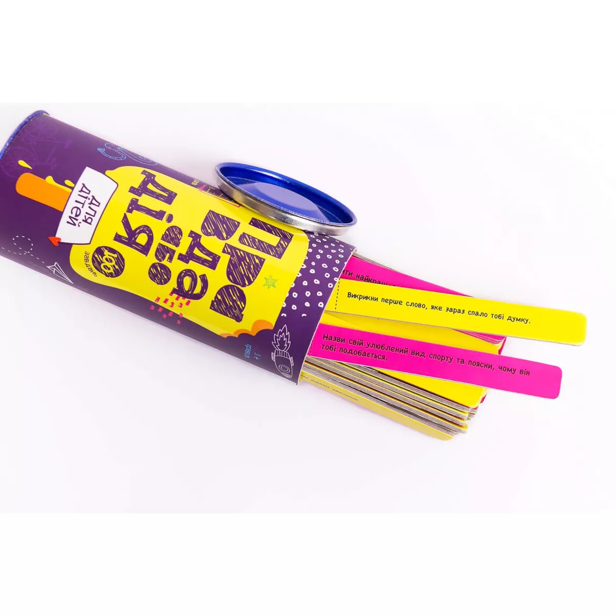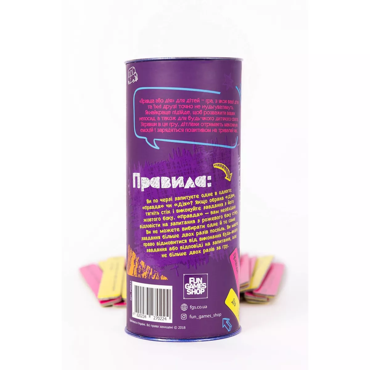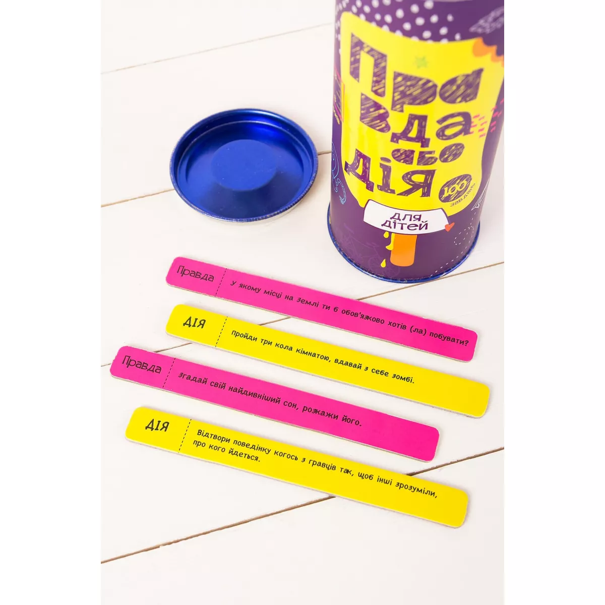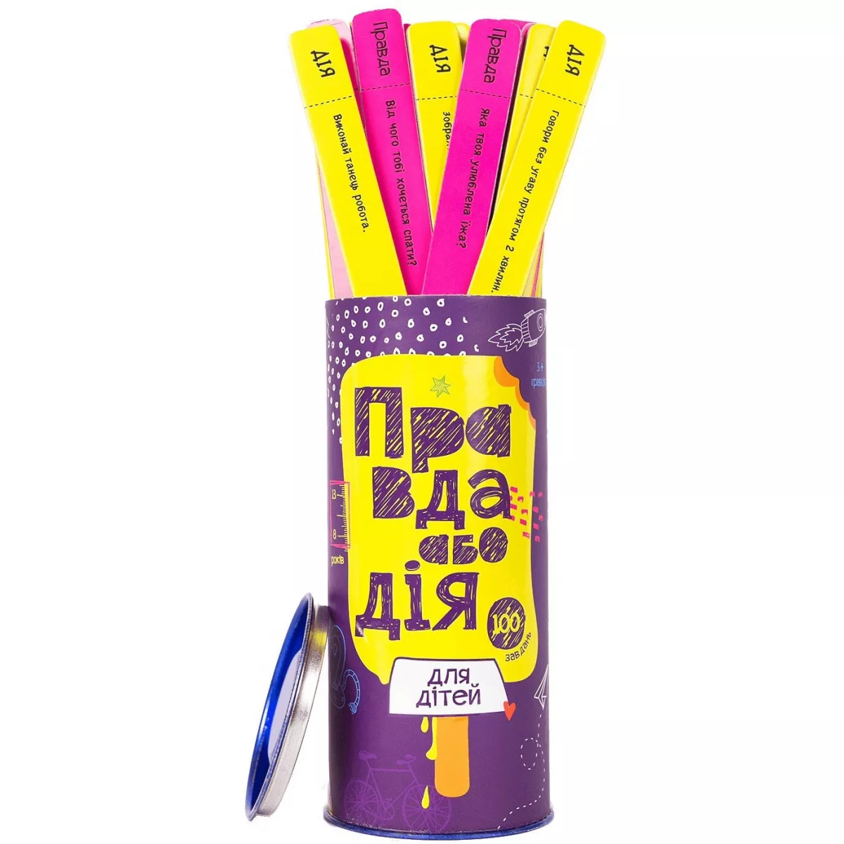 Настільна гра Правда або Дія: Для дітей найбільш адаптована для вікової категорії від 8 до 13 років, а також може стати спільною улюбленою сімейною розвагою. Кількість гравців стартує від 3 і може бути необмежена. Невелика яскрава коробочка у формі тубуса, схожа на пачку смачного печива, вже привертає увагу і як би закликає. «Відкрий мене!» - так і просить упаковка. Що ж всередині? В середині знаходяться 50 променистих жовто-рожевих двосторонніх стіків. На одній стороні стіку написане питання, а на іншій - дія. Загалом, все вас чекає 50 питань і 50 дій, а це цілих 100 хитромудрих завдань! Учасники визначаються з порядком черговості ходу. Зручніше це робити традиційно: по колу або за годинниковою стрілкою. Активний гравець вибирає між правдою і дією, озвучуючи іншим, що він обрав - «Правду» або «Дію». Потім не дивлячись, потрібно витягнути з коробочки один стік. Гравець, який вибрав «Правду» повинен відповісти на питання з рожевою боку смужки, а якщо вирішив порадувати присутніх кумедною витівкою із завдань «Дія» - виконує завдання з жовтою боку. Все добре, але от тільки забороняється вибирати два рази поспіль одне й те саме завдання! Якщо учасник боїться когось образити своїм одкровенням або соромиться виконувати отриману дію, він має право два рази за всю партію відмовитися відповідати на питання або виконувати активне завдання. Надто вже компрометуючих питань в грі немає. Адже це дитячий набір. Але, так чи інакше, доведеться, наприклад, розкрити таємницю про те, чи прикидався ти хворим, щоб не йти в школу. Або зізнатися, яку дивну їжу доводилося вживати. Аби тільки бабусі ніхто не сказав, що її вареники зі шпинатом - це блюдо на любителя, і ви в їх число не входите. Завдання з дій теж прості і веселі. Адже немає нічого складного щоб говорити без упину протягом пари хвилин або кукурікати в вікно. Можна зізнатися, що це найулюбленіше заняття і піти героїчно виконувати його з гордо піднятою головою.