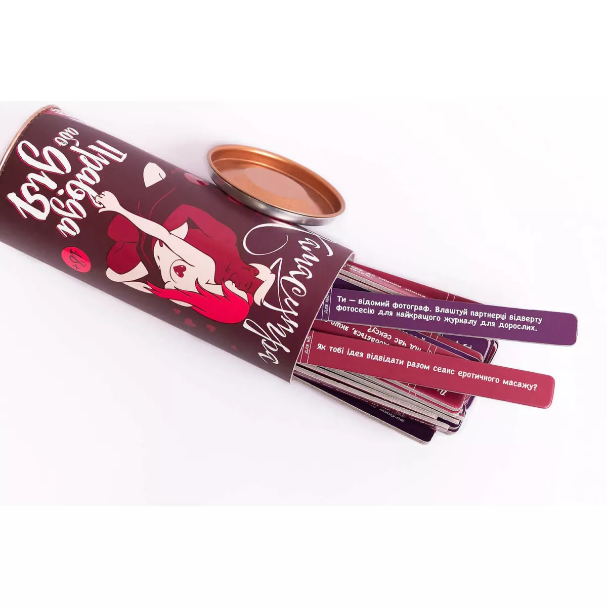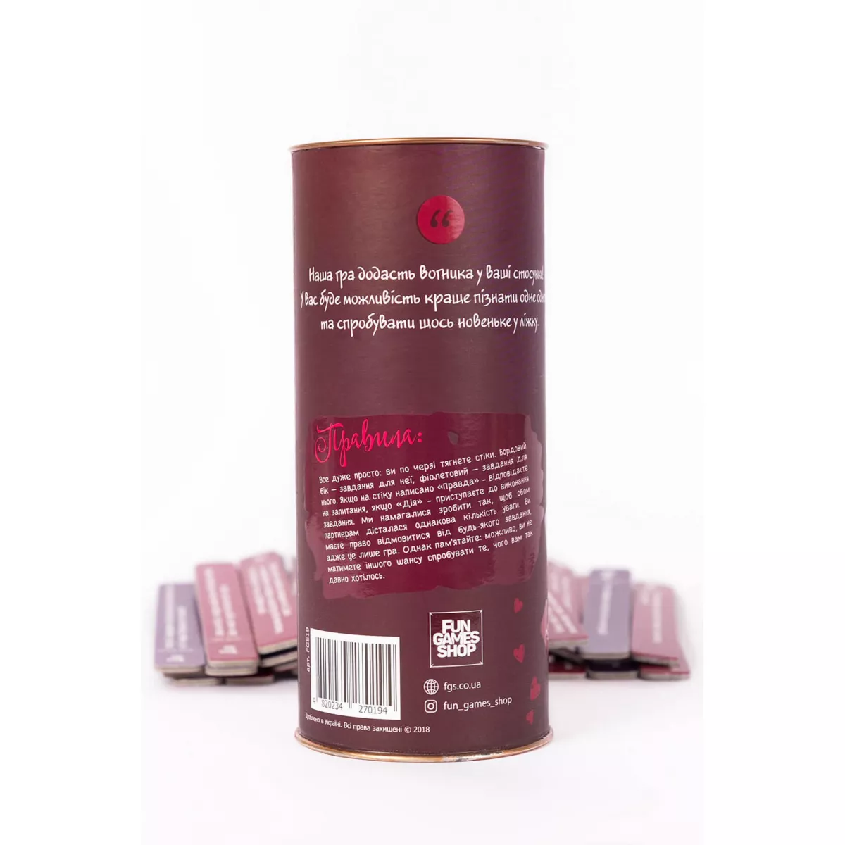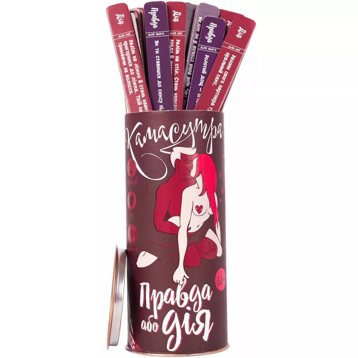 Настільна гра Правда або Дія: Камасутра була придумана для двох. У загадковому тубусі-упаковці приховані від сторонніх очей досить пікантні і відверті завдання. Ця гра покликана для розслаблення. Вона допомагає ділитися сміливими думками один з одним. І надає шикарний шанс краще пізнати свого партнера, випробувати щось нове і відчути смаки нових відчуттів. 2 типи завдань настільної гри Правда або Дія: Камасутра, як і в інших іграх цієї серії, поділяються на правду і дію. П'ятдесят яскравий стіків, що ховаються в коробці, будуть задавати Вам дуже відверті запитання, на які обов'язково і беззаперечно потрібно відповідати відверто. В ході гри з'ясовуються вельми несподівані речі. Напевно, кожному з партнерів хочеться дізнатися, які фантазії переслідують її хлопця, або його дівчину. І, хто знає, можливо скоро відповіді на всі каверзні питання гри доведеться випробувати в практиці, перейшовши до «справи». Дана версія гри Правда або Дія має деякі відмінності в правилах. Так, гра сама вибере, чим Вас зайняти в поточний момент - правдою чи дією. Учасникам же ігрового процесу потрібно робити вибір «як?» ... Не соромтеся розкрити стильну упаковку гри у відповідній обстановці. Тягніть один за одним стіки з завданнями в сліпу. Вони будуть відрізнятися за кольором, щоб визначати, кому призначається завдання. Червоний колір - для неї, а фіолетовий - для нього. А далі... сміливо беріться за виконання завдання! Звичайно, від виконання певного завдання можна і відмовитися. Але навіщо ж втрачати шанс для того, щоб отримати задоволення ?! Прекрасна та гра, в якій перемагає дружба. Гм... Хоча гра Правда або Дія: Камасутра створена для того, щоб йти далі. Прекрасний варіант на 14 лютого - купити настільну гри Правда або Дія: Камасутра для свого хлопця чи дівчини. Вона дає можливість за веселим проведенням часу краще зрозуміти один одного і дізнатися найпотаємніші бажання своєї половинки. А також погляди й уподобання партнера. Ну а для того, щоб провести час в більш широкому колі друзів, на природі або в затишній вітальні, більше підійде гра Правда або Дія: Для компаній. Окремо для дівчат також придумали розвагу: Правда або Дія: Дівич-вечір. Настав час дізнатися один про одного всі таємні подробиці...