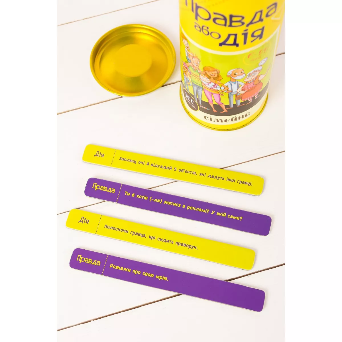 "Правда або Дія: Сімейна" — це гра для всієї родини і чудовий спосіб зробити спільний вечір цікавим та пізнавальним для всієї родини. Гра допоможе згуртувати родину та дізнатися більше про кожного. Тож, приготуйтесь до позитивного вечора у колі найрідніших!