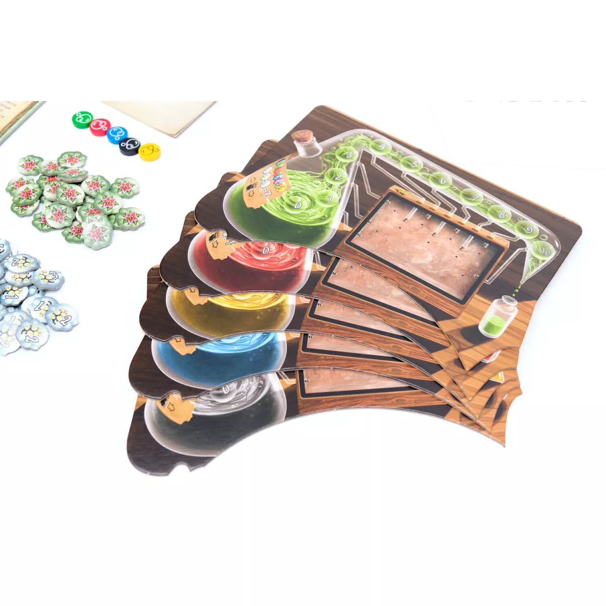 У коробці 5 фішок есенцій;, 5 колб алхіміків;, 8 карток пацієнтів;, 8 жетонів пацієнтів;, 2 двосторонні книги рецептів;, 20 карт прогнозів;, 20 карт есенцій;, 30 жетонів дурману;, 40 запасних білих жетонів;, Правила гри.