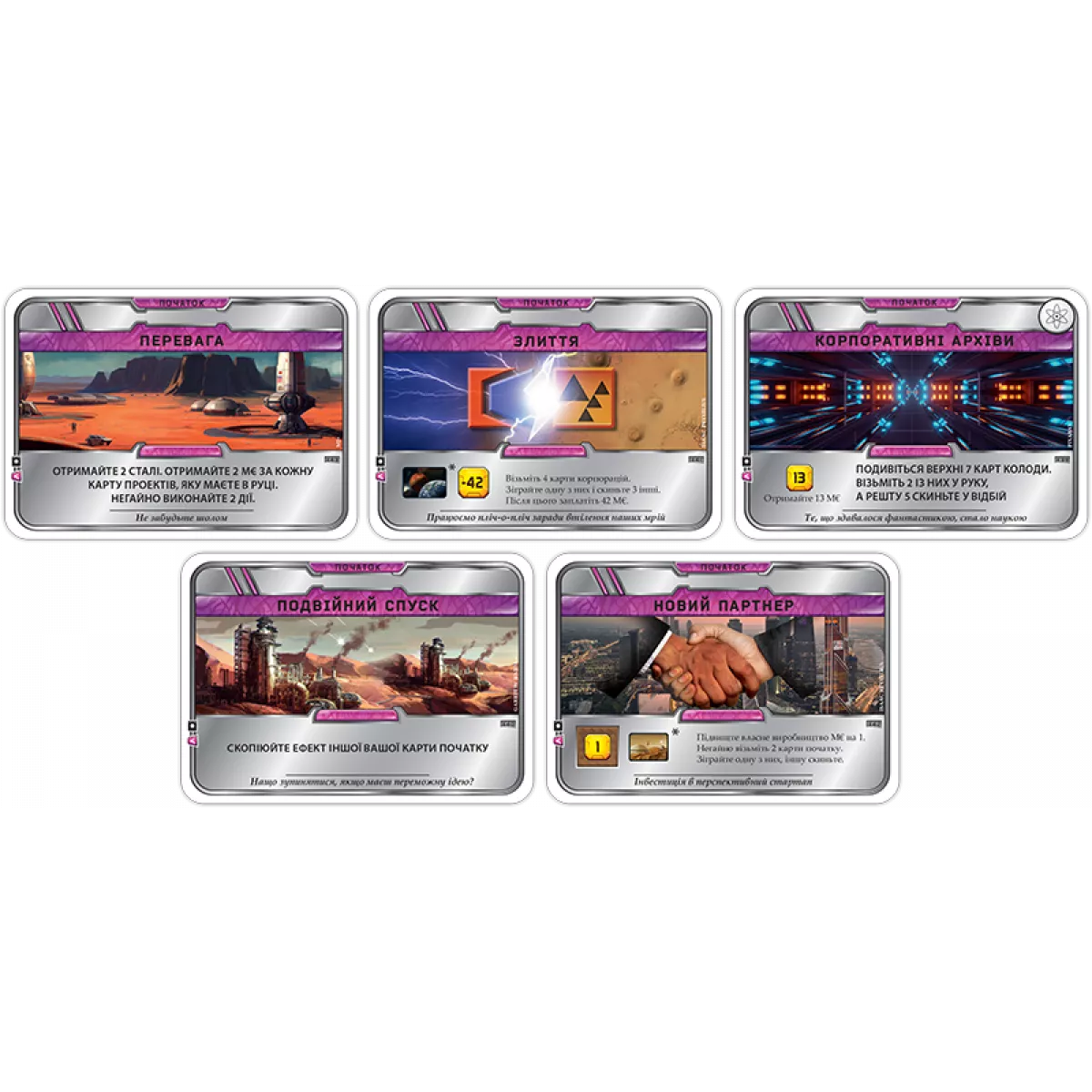 • Новий партнер: Ця карта може дозволити вам отримати додатковий ресурс або перевагу на початку гри, задавши тон для вашої стратегії. Можливо, це буде додатковий мегакредит або цінний сталевий ресурс, який дозволить вам швидше розбудувати свою інфраструктуру. Отримання нового партнера на початку гри може бути вирішальним фактором, який дозволить вам отримати перевагу над конкурентами та ефективніше виконувати завдання тераформування.