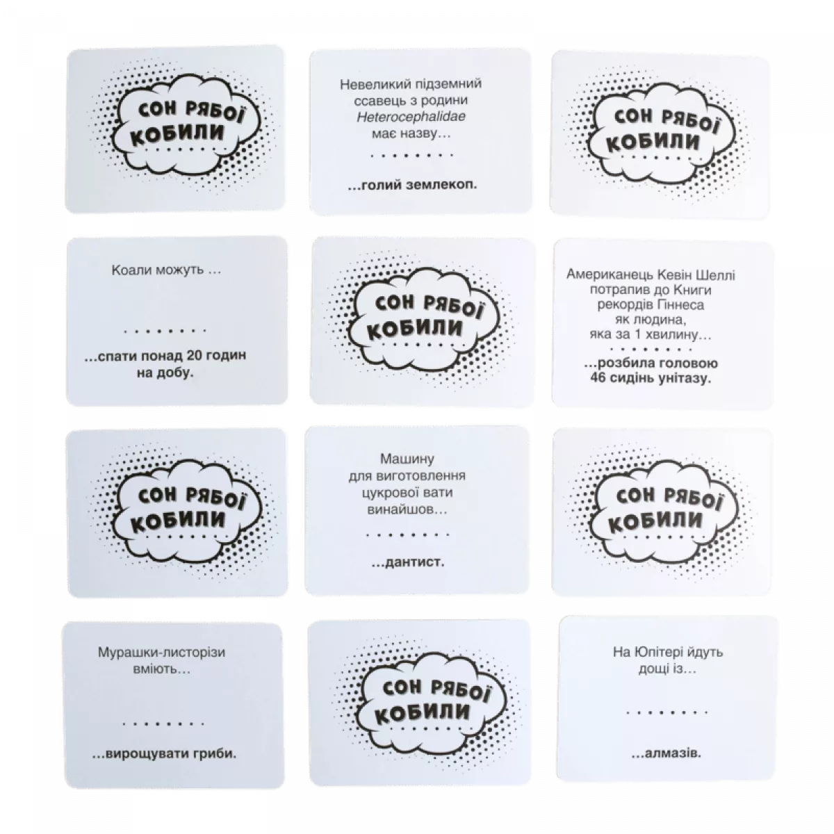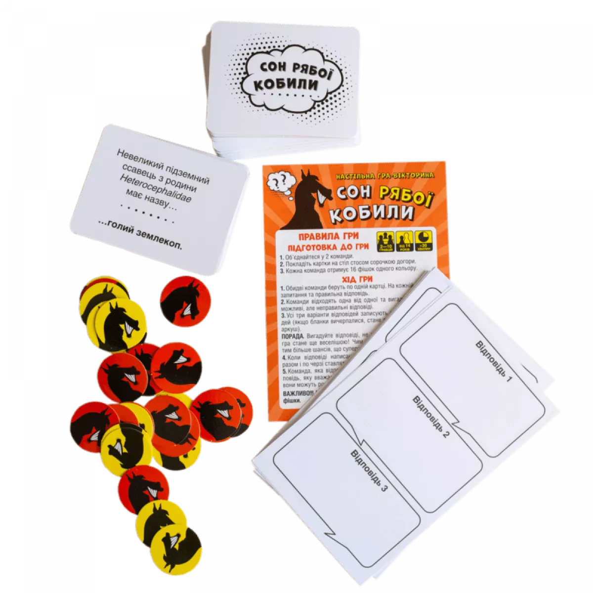 "Сон рябої кобили" – це нетипова логічна вікторина, де переможцем стає не той, хто знає всі правильні відповіді, а той, хто здатен вигадати найпереконливішу, найсмішнішу або найоригінальнішу відповідь на абсолютно абсурдне питання. Кожне питання – це маленький виклик для вашого креативного мислення, а кожна відповідь – це шанс блиснути дотепністю та уявою. У грі представлено 224 унікальні карти, кожна з яких містить химерне питання, що здається вирваним з найглибших закутків дивних снів чи міських легенд. Ваше завдання – запропонувати відповідь, яка буде настільки правдоподібною або настільки божевільною, що інші гравці повірять у її автентичність або просто вибухнуть від сміху. Механіка гри дозволяє учасникам не лише вигадувати власні варіанти пояснень, а й обирати найкращі з запропонованих іншими гравцями, голосуючи за найбільш вдалу чи найсмішнішу відповідь. Це робить ігровий процес динамічним, інтерактивним та непередбачуваним, адже ніколи не знаєш, яка відповідь виявиться найпопулярнішою. Ця настільна гра ідеально підходить для тих, хто втомився від стандартних вікторин, що вимагають лише фактичних знань, і шукає щось справді свіже, неординарне та захопливе, що дасть волю їхній фантазії та почуттю гумору. Це справжній ковток свіжого повітря у світі настільних розваг!