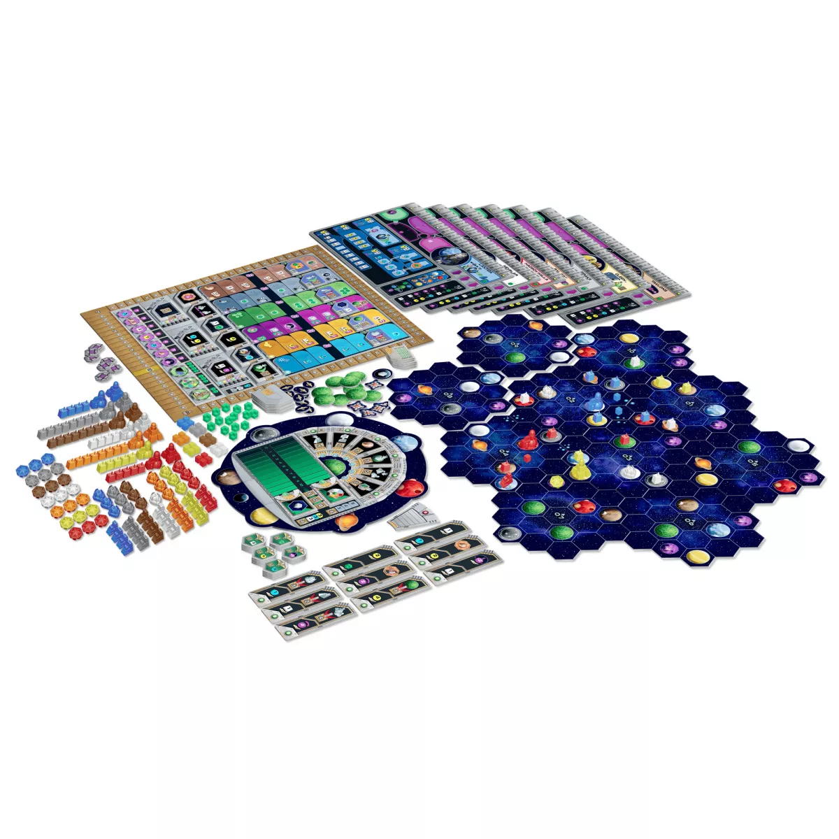 У коробці Модульне ігрове поле з 10 космічних секторів, Поле досліджень, Поле для підрахунку очок, 7 двосторонніх планшетів цивілізацій, 126 фігурок будівель, 354 фішки, 151 жетон і 1 підставка, 4 пам'ятки, 1 карта порядку ходу, Правила гри, 25 карт, правила і пам'ятка для одиночної гри