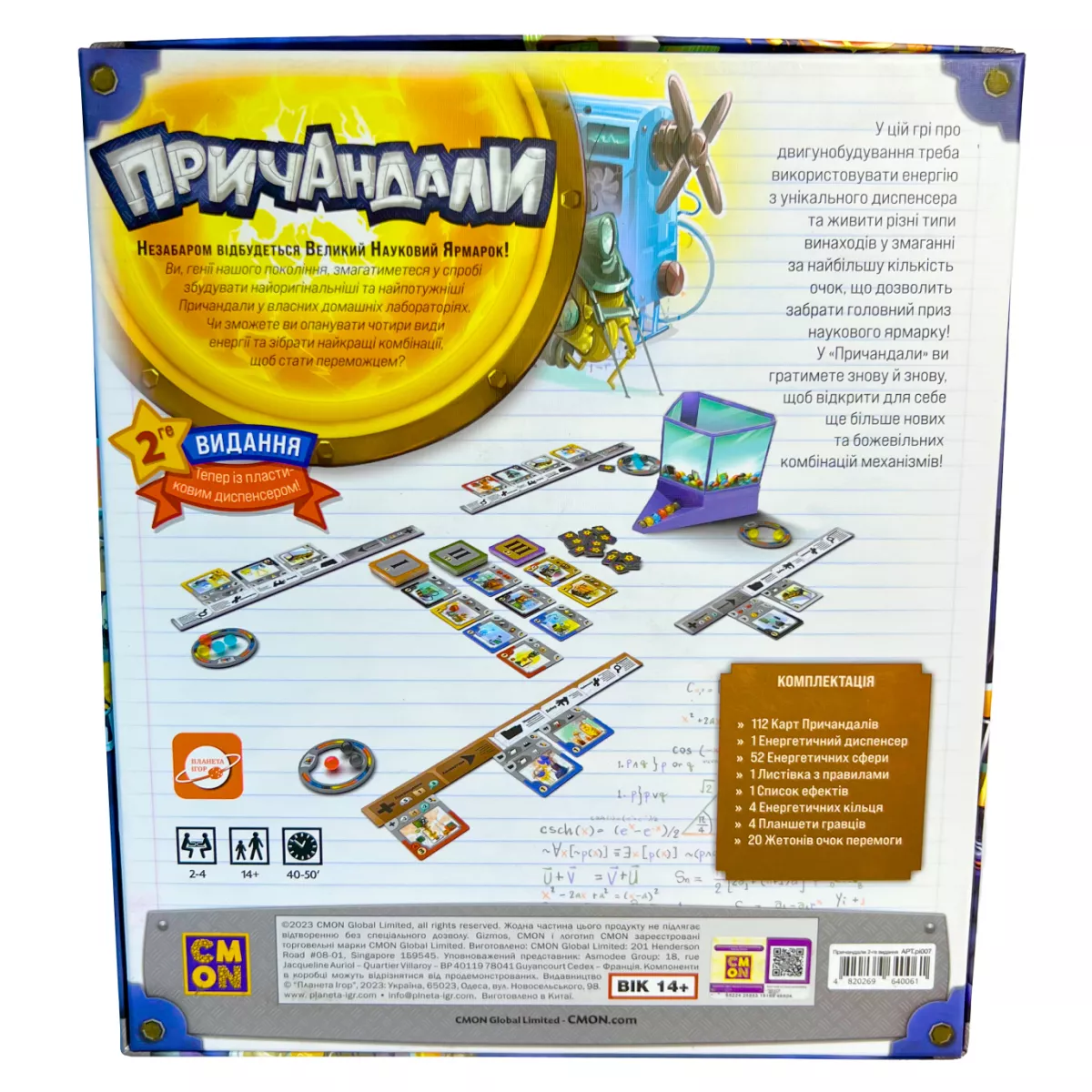 У коробці енергетичний диспенсер, 112 карт причандалів, 52 енергетичних сфери, 20 жетонів очок перемоги, 4 енергетичних кільця, 4 планшети гравців, список ефектів, правила гри