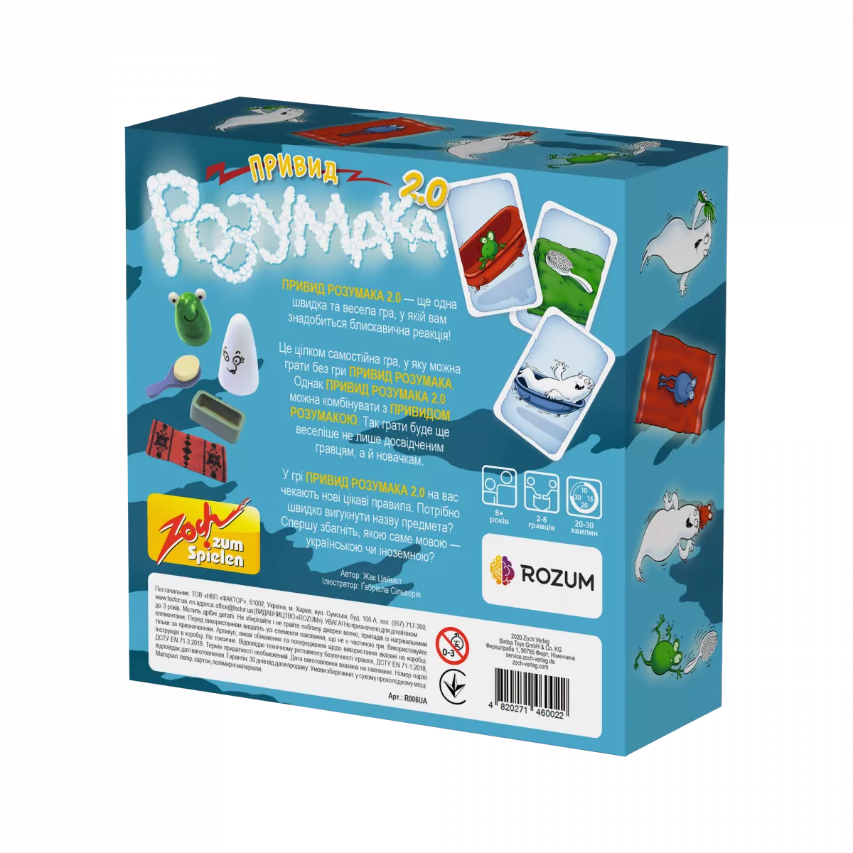 У Привида Розумаки у його замку з'явилась подружка! Вона не тільки зайняла ванну в іншій частині старовинного маєтку, але й постійно вигукує слова іноземними мовами. От дивачка! Подруга Розумаки теж любить фотографуватися, але фотоапарат досі плутає кольори... А отже, гостям замку буде чим зайнятись у грі «Привид Розумака 2.0» - сиквелі «Привида Розумаки» із новими складнішими режимами й не такими простими предметами. Хоча подейкують, що у замку є й ще один мешканець, якого можна зустріти у грі «Привид Розумак, котра година?». А ще кажуть, буцімто у дві перші гри можна грати разом, як наче це одна настілка!