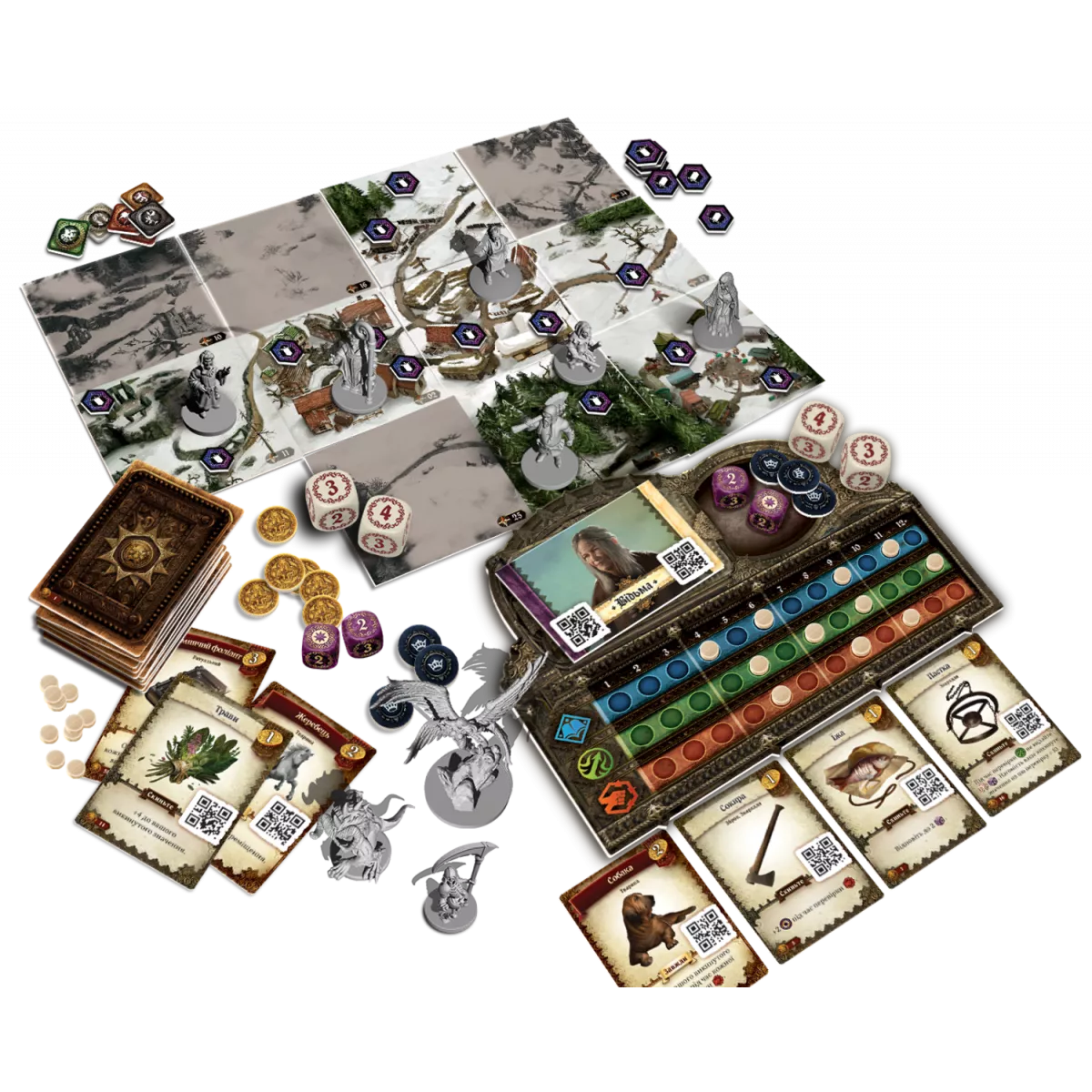 У коробці 67 плиток мапи, 150 карт предметів, 15 карт призначення, 26 жетонів особливих локацій, 20 жетонів монет, 3 планшети гравців, 6 основних кісток, 9 кісток зусиль, 20 жетонів досвіду, 36 маркерів умінь, 10 жетонів торгівлі (10 пар), 31 фігурка, правила гри