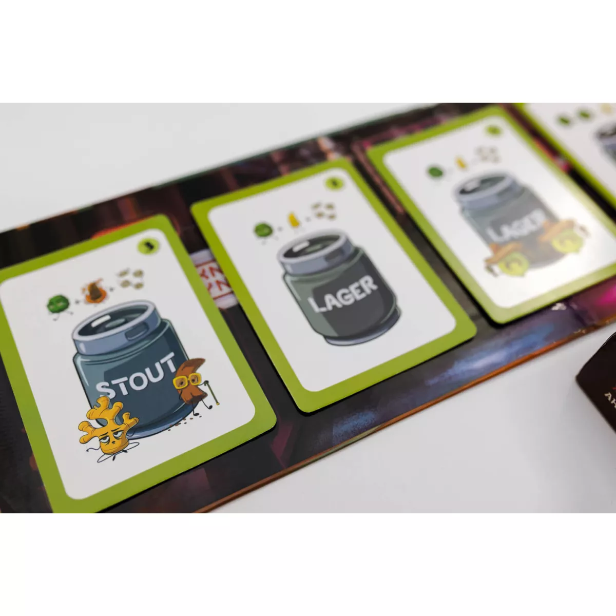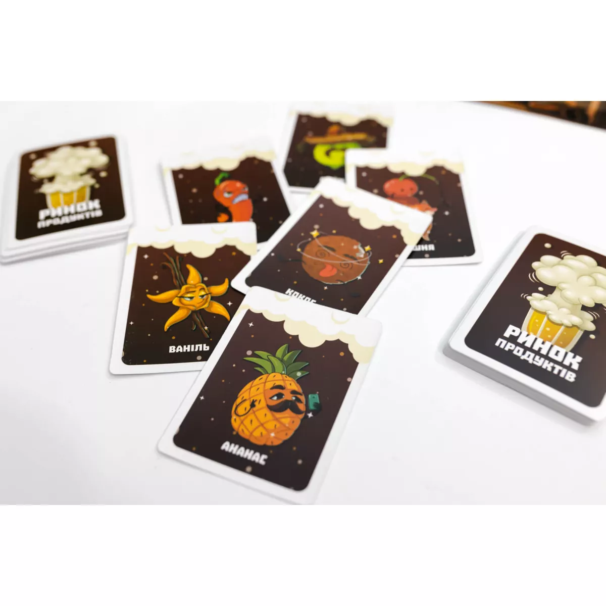 У коробці 189 карт -, • 60 карт подій, • 43 карти сировини, • 46 карт замовлень, • 40 карт продуктів, 5 лічильників балів, 1 двосторонній тайл локацій, 1 правила