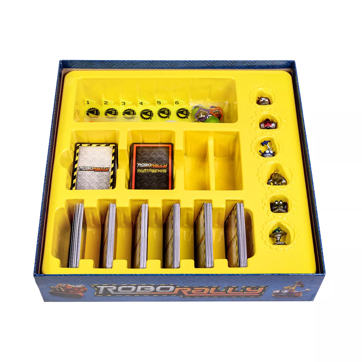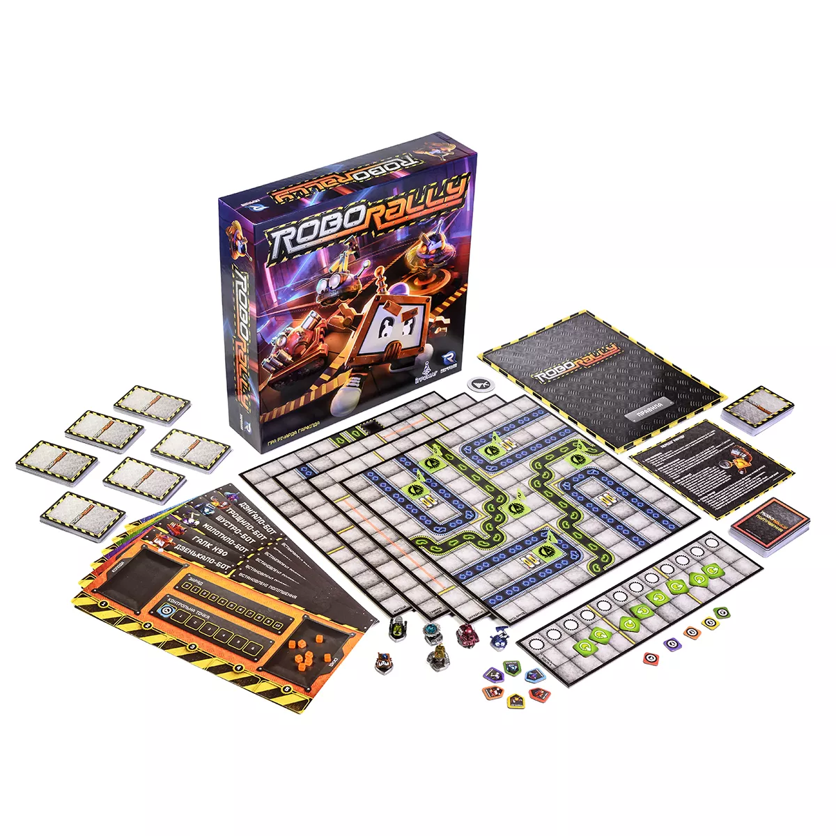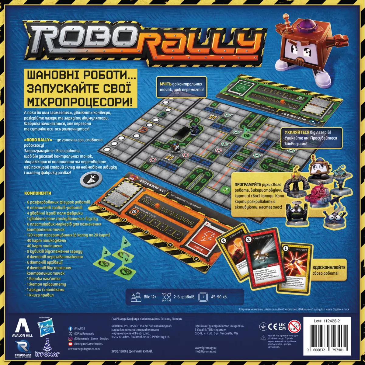 «Robo Rally» — стратегічна гра-перегони, у якій гравці програмують своїх роботів, щоб подолати небезпечну трасу і першими відмітитись у всіх контрольних точках. Вам доведеться ретельно планувати рухи, поліпшувати систему й уникати пасток, щоб випередити суперників. Гра поєднує тактику і хаос, перетворюючи звичайний склад на поле битви розумних машин.
