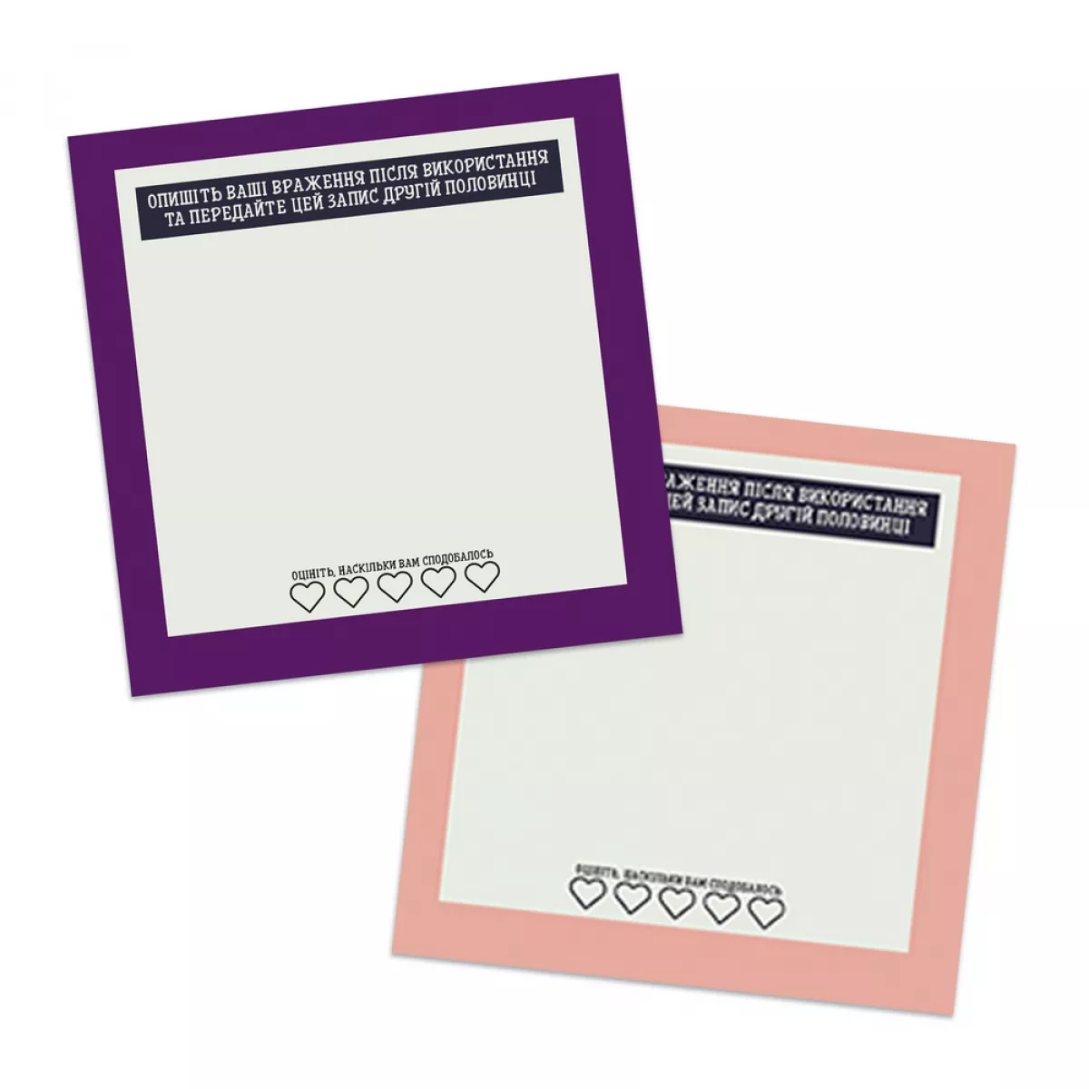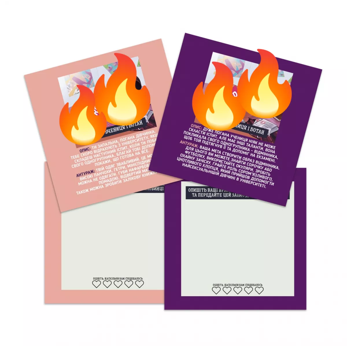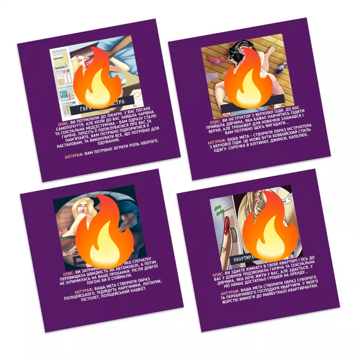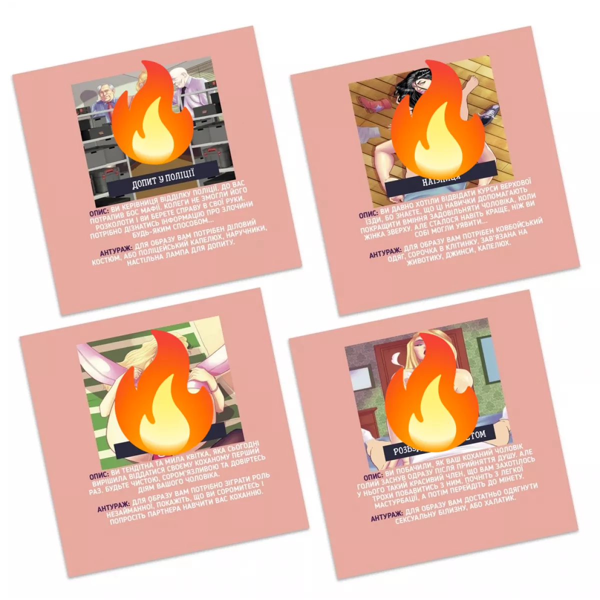 У комплекті 24 картки: по 12 з готовими сценаріями для яскравих моментів близькості для чоловіка та жінки. Приклади сценаріїв включають: