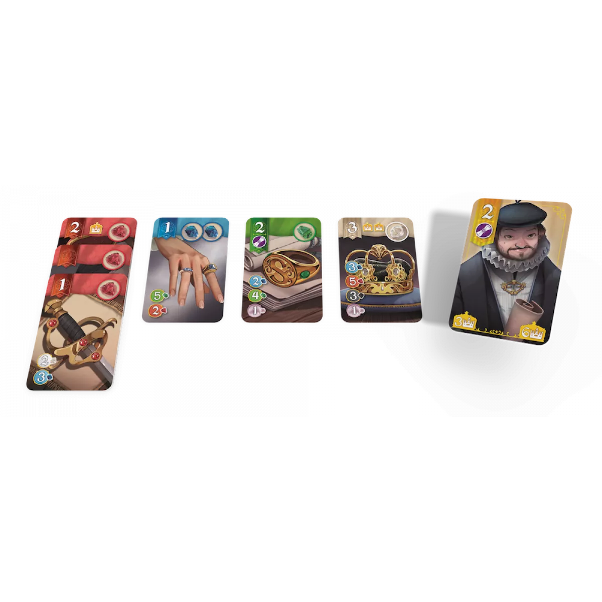 У коробці 1 плитка перемоги, , 67 карт коштовностей, , 1 сумка, , 3 сувої привілеїв, , 25 пластикових жетонів дорогоцінних каменів, , 1 загальна дошка, , 4 королівські карти, , 1 буклет правил.