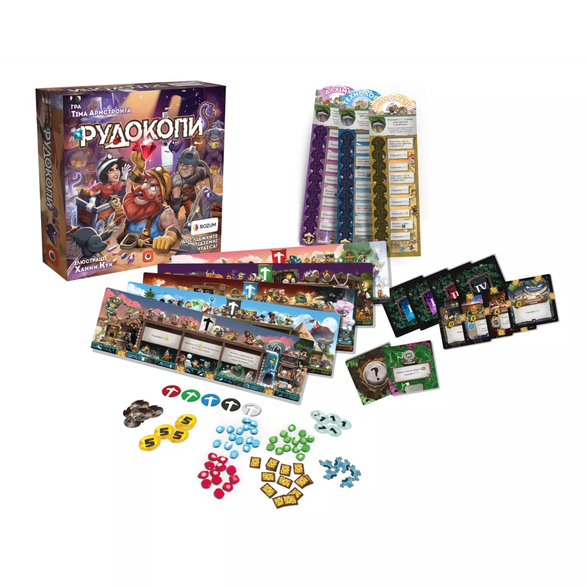 Шукачі скарбів поділяються на два типи: ті, хто не розуміє, навіщо копирсатися в землі, та ті, хто знає, де шукати коштовності! І відчайдухи із гри Рудокопи відносяться саме до другого типу, бо знають де копнути, куди стукнути, що почистити, аби витягти із глибин землі гори золота! Гра Рудокопи розрахована на компанію до 5 гравців, які впродовж години усе глибше і глибше будуть занурюватись у надра землі, розбудовуючи власний картковий «двигун». Кожна наступна розіграна карта буде активувати ефекти і всіх попередніх карток, підвищуючи продуктивність видобутку, наче лавина, яка злітає з гори! Тільки у цьому випадку вона летить не з гори, а в гору. Може тоді це і не лавина?.. Ох, немає часу на такі думки, золото самостійно себе із землі не дістане! Картки тунелів, які будуть викладати гравці, належать до різних фракцій, кожна з них має свої власні бонуси та переваги. Змішуючи у своїй штольні картки цих фракцій, ви можете побудувати власну стратегію, яка буде відповідати меті саме цієї партії! А що, мета партій змінюється? Глобально, звичайно, досі треба набрати якомога більше переможних очок. Та шлях отримання цих очок - це вже інша історія! У кожній грs беруть участь випадкові планшети прогресу, які дають бонуси до виробництва та пришвидшують вас на шляху до перемоги, якщо, звичайно, вірно і вчасно їх активувати! Тому, якщо ви готові зануритись у глибини землі у пошуках золотих родовищ – скоріше кличте друзів або родичів, наточуйте кирки, будуйте плани на багате життя та замовляйте гру Рудокопи, яка принесе вам безліч неповторних емоцій, адже справжній скарб - це якісно і позитивно проведений час! Коли ж ви бажаєте поринути у більш скажені пригоди, щоб і пастки оминати, і гобліни за вами ганялися вузькими тунелями, і дракон намагався вас приготувати собі на вечерю, то зверніть увагу на фентезійну гру Кланк! Катакомби.