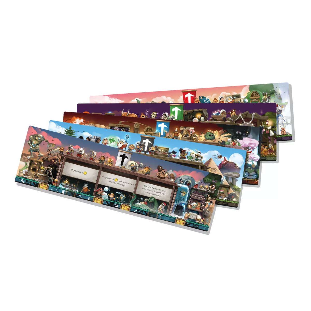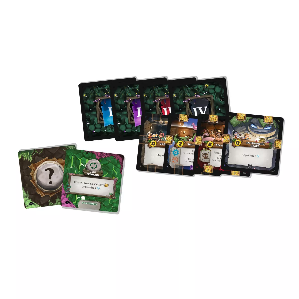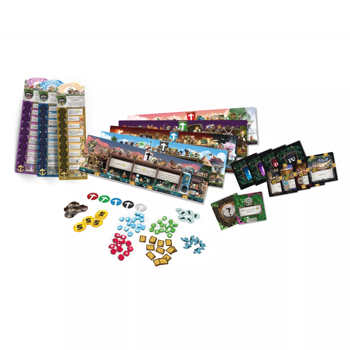 У коробці 150 карт, 100 жетонів, 8 дощок прогресу, 40 дерев'яних маркерів