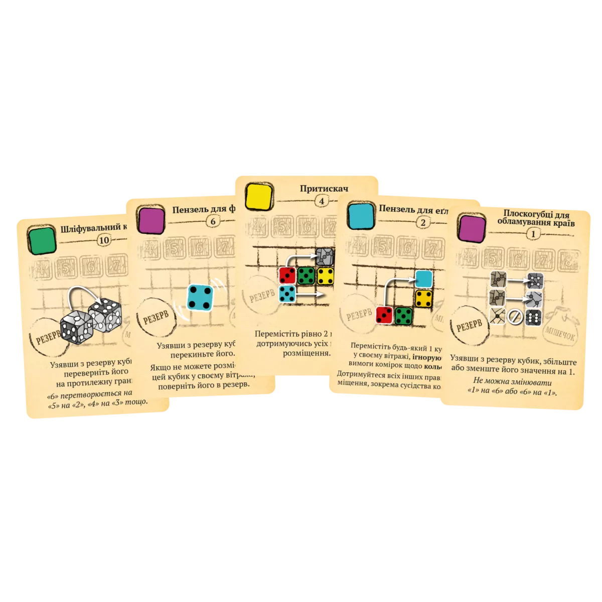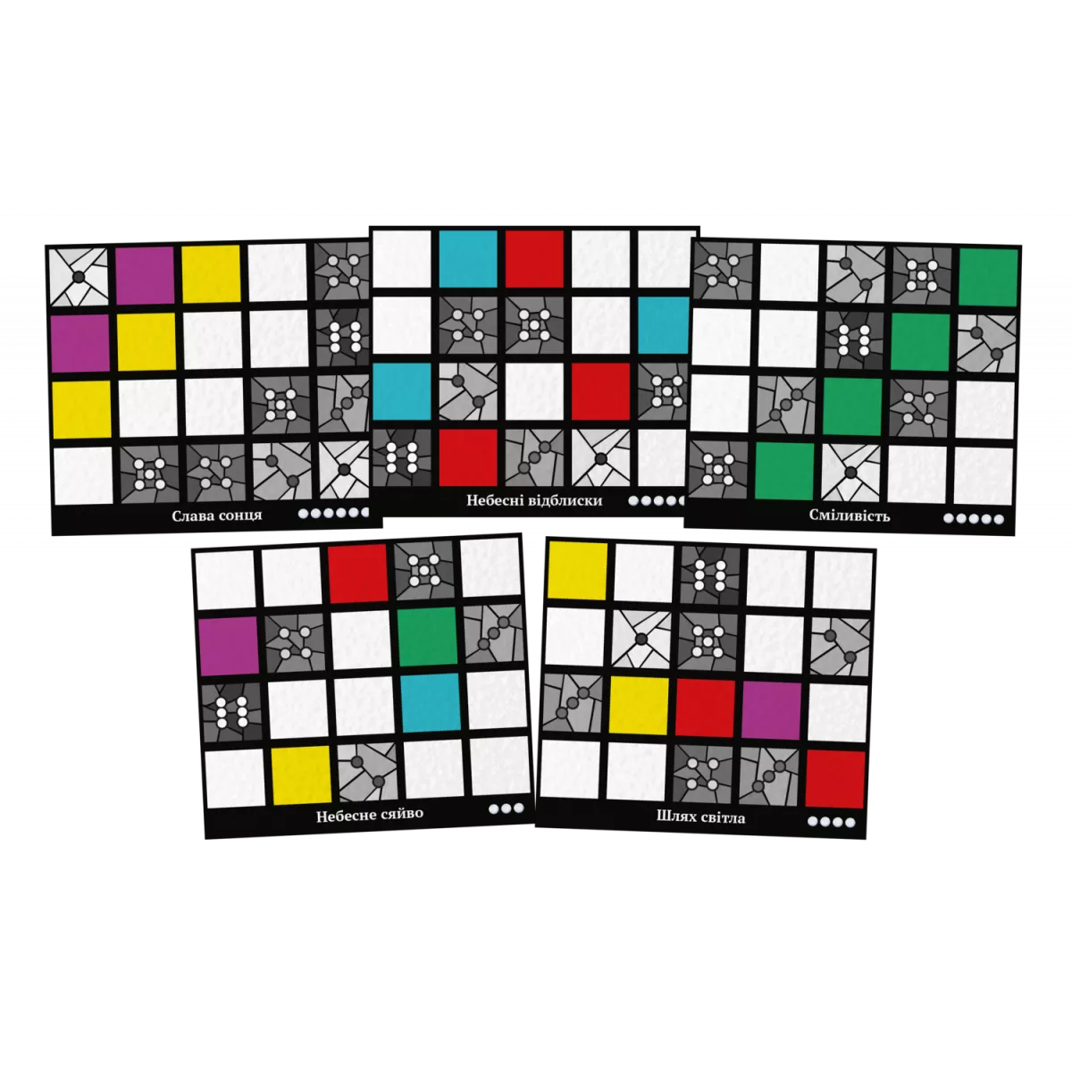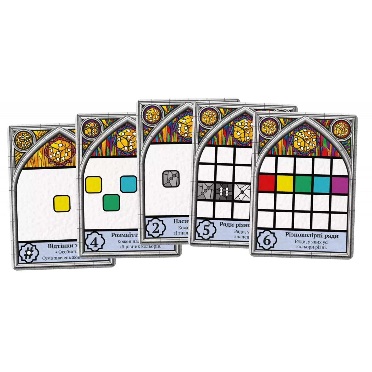 У коробці 12 карт вітражів, 2 промокарти вітражів, 13 карт інструментів, 90 кубиків (по 18 червоного, жовтого, зеленого, синього й фіолетового кольорів), Мішечок для кубиків, 10 карт загальних цілей, 4 маркери очок, 5 карт особистих цілей, 24 фішки привілеїв, 4 планшети віконних рам, Трек раундів і переможних очок, Правила