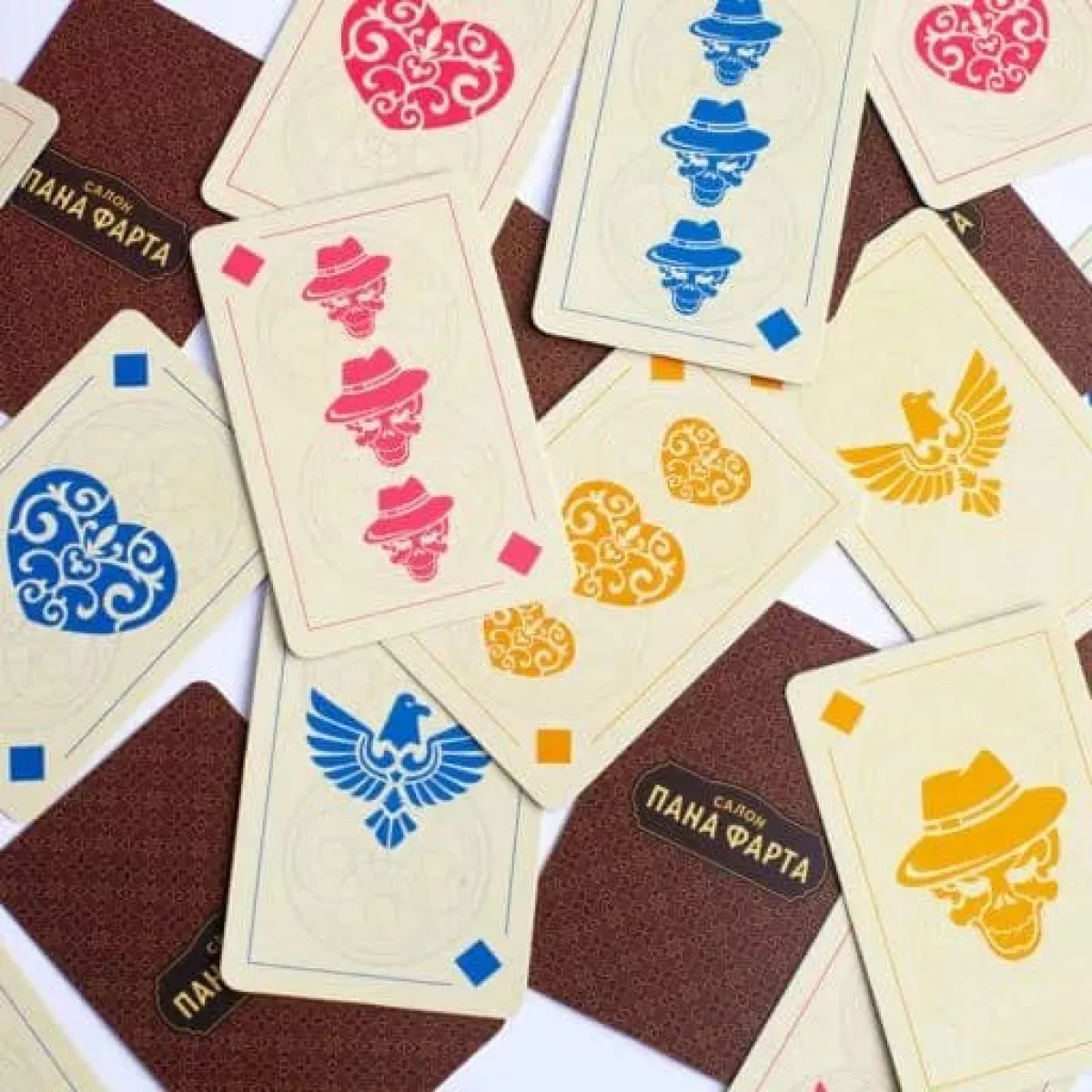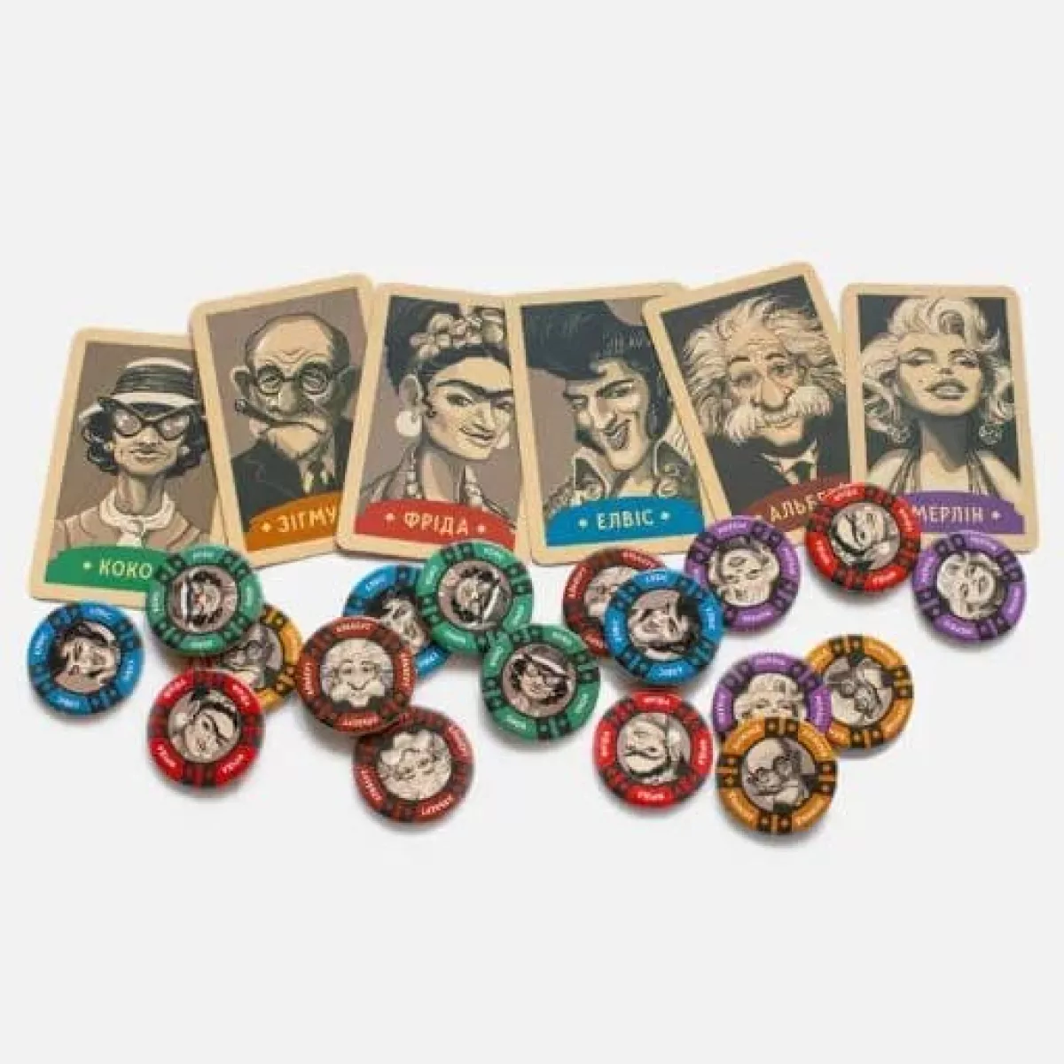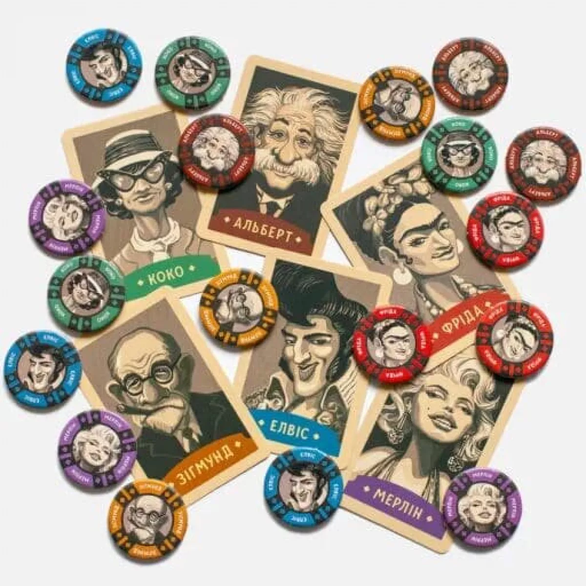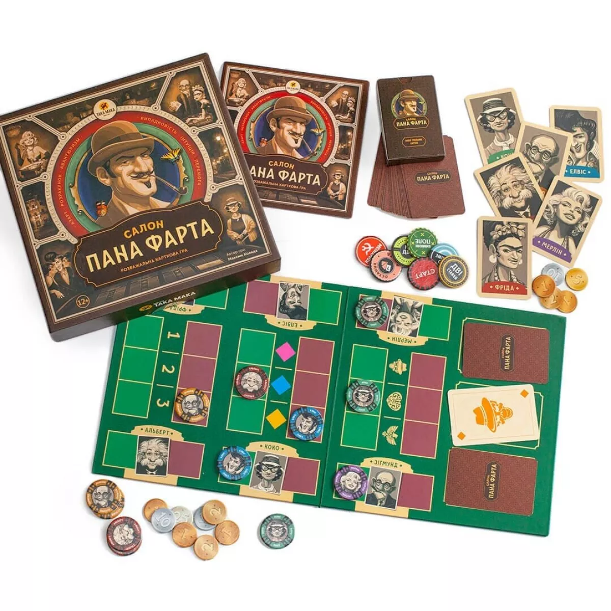 До Салону пана Фарта приходять пограти найвизначніші люди: Елвіс Преслі, Альберт Ейнштейн, Фріда Кало, Зігмунд Фройд, Коко де Шанель і навіть Мерлін Монро. У нашому елітному закладі вони можуть просто розважитися: зробити декілька ставок, опираючись на свою логіку, інтуїцію чи банальну удачу. Капітал може як збільшитися, так і зменшитися, це вже як карта ляже. У настільній грі Салон пана Фарта вам доведеться випробувати свою удачу разом із іншими учасниками. Як ви думаєте, ви достатньо фартові? У цій веселій компанійській грі кожен із вас візьме собі одного з легендарних людей: Елвіса, Альберта, Фріду, Коко, Зігмунда та Мерлін. За допомогою невеликої колоди із 27 карт ви влаштуєте незабутнє дійство. Протягом гри вам належить робити ставки на те, чи випадуть певні елементи, їх колір і кількість. Також можна прогнозувати, чи зіграють ставки інших гравців. На кожній карті є 1, 2 чи 3 символи: серце, череп або орел. Кожен із них ще й матиме свій колір: синій, жовтий, рожевий. Всього 27 карт. Прогнозуйте результат, щоби мати шанси на успіх. Або просто надійтеся на результат. Салон пана Фарта пропонує одразу 2 варіанти гри: Турнір і Капітал. Кожен із них має свої відмінності й особливості, але обов'язково сподобається всім гравцям. У Турнірі на вас очікує декілька турів, що складаються із 5 раундів. Один раунд ‒ це і є ваші ставки. На початку туру ви матимете по 3 фішки, але кожна ваша неправильна ставка забиратиме їх. Якщо наприкінці туру ви маєте найбільшу кількість фішок, ви отримуєте одну монету. Таких переможців може бути декілька. Зберіть три монетки, що виграти у всьому турнірі. Капітал же перетворює Салон пана Фарта в економічну стратегію. На початку партії ви отримуєте лиш 2 фішки та цілих 10 монет. Тепер кожна ставка приймається тільки із грошима ‒ ви можете як втратити їх, так і подвоїти. Заробіть капітал у 100 монет, щоби виграти в партії. Завжди на початку раунду можна купити чи продати одну зі своїх фішок за 10 монет. І не забувайте про особливі жетони Сили, які дають вам цікаві властивості. Робіть свої ставки, пані та панове! Салон пана Фарта ‒ весела настільна гра, у якій багато що залежить саме від вашої удачі. Ви можете обрати будь-яку тактику: включати інтуїцію, мислити логічно чи просто надіятись на чистий фарт. У будь-якому випадку старайтеся отримати задоволення від процесу в цьому імпровізованому казино. Ви вийдете з нього або переможцем, або із порожніми кишенями. Не втрачайте можливість випробувати свою удачу в настільній грі Селестія, де нагорода залежить тільки від того, наскільки сильно ви готові ризикнути.