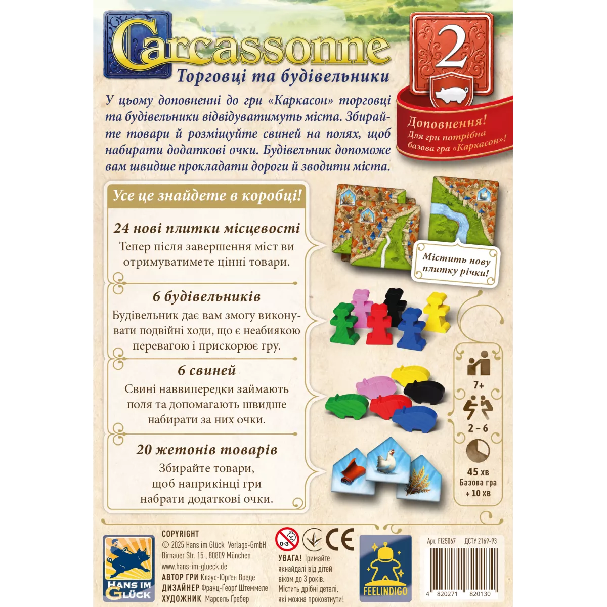 З доповненням "Торговці та Будівельники" ігрове поле "Каркасону" оживає новими елементами, які не лише розширюють стратегічні можливості, але й додають тематичного колориту. Вирушайте у подорож, де кожен ваш крок матиме подвійне значення, а кожне рішення впливатиме на подальший розвиток вашої імперії.