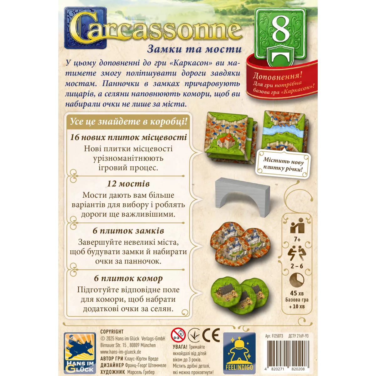 Це доповнення розраховане на 2-6 гравців віком від 8 років, забезпечуючи ігровий час у межах 30-45 хвилин. Завдяки своїй мовній незалежності (мова гри – українська, але текст на компонентах відсутній) та зрозумілим правилам, воно легко інтегрується у ваш Каркасон і швидко стає улюбленим елементом вашої колекції.