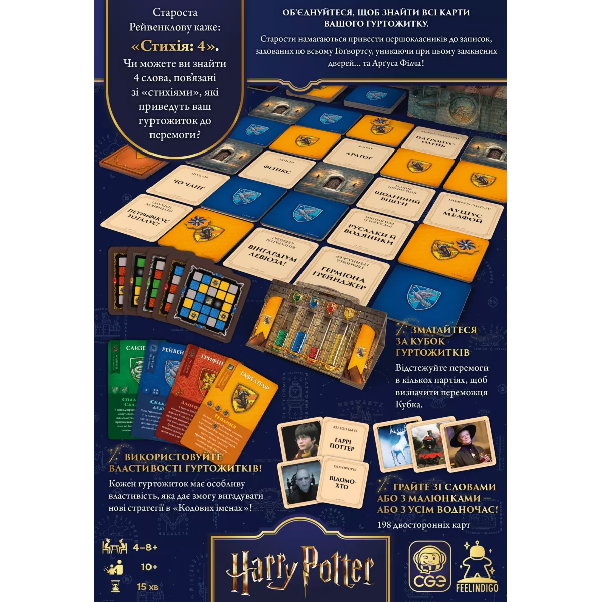 Ця версія популярної настільної гри «Кодові імена» створена спеціально для фанатів Гаррі Поттера, пропонуючи їм абсолютно новий досвід. На ігровому полі ви побачите картки зі словами та ілюстраціями, що зображують улюблених героїв, могутні закляття, фантастичних істот та легендарні місця з книг та фільмів. Мета залишається незмінною: дві команди змагаються за право першими розкрити всіх своїх таємних агентів. Капітани команд дають підказки, що складаються з одного слова та однієї цифри, вказуючи, скільки слів на полі асоціюються з цією підказкою. Гравці ж повинні проявити кмітливість, щоб правильно зрозуміти натяк капітана і не натрапити на агентів противника або, що ще гірше, на підступного Вбивцю, який негайно припинить гру для вашої команди. Завдяки українському виданню, ви зможете повністю зануритися у гру, насолоджуючись рідною мовою та улюбленими персонажами.