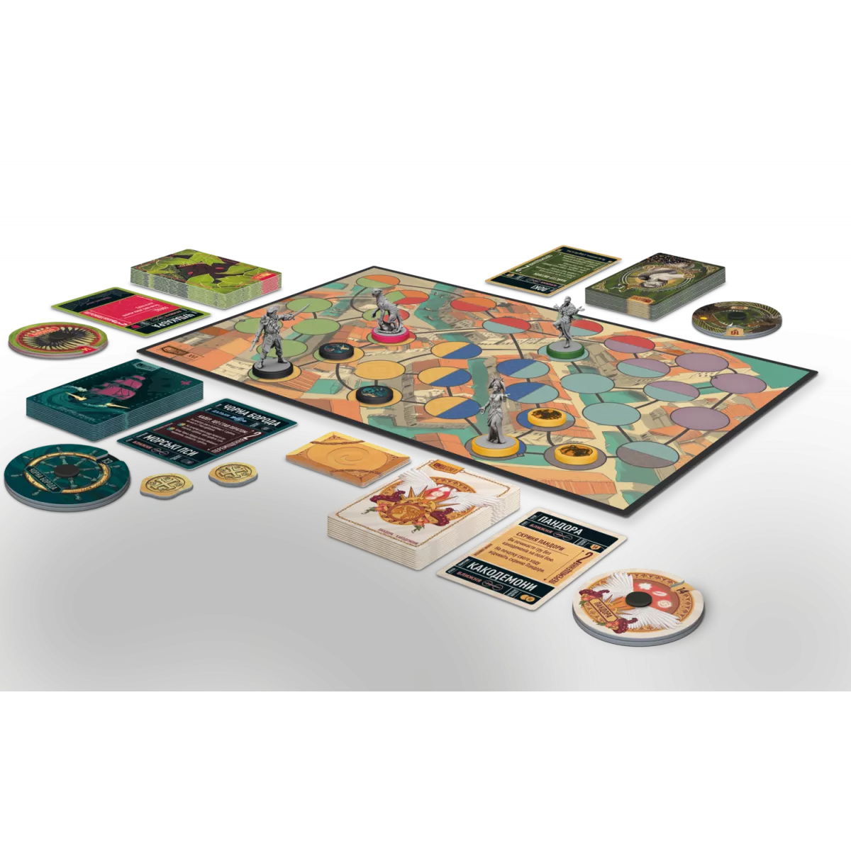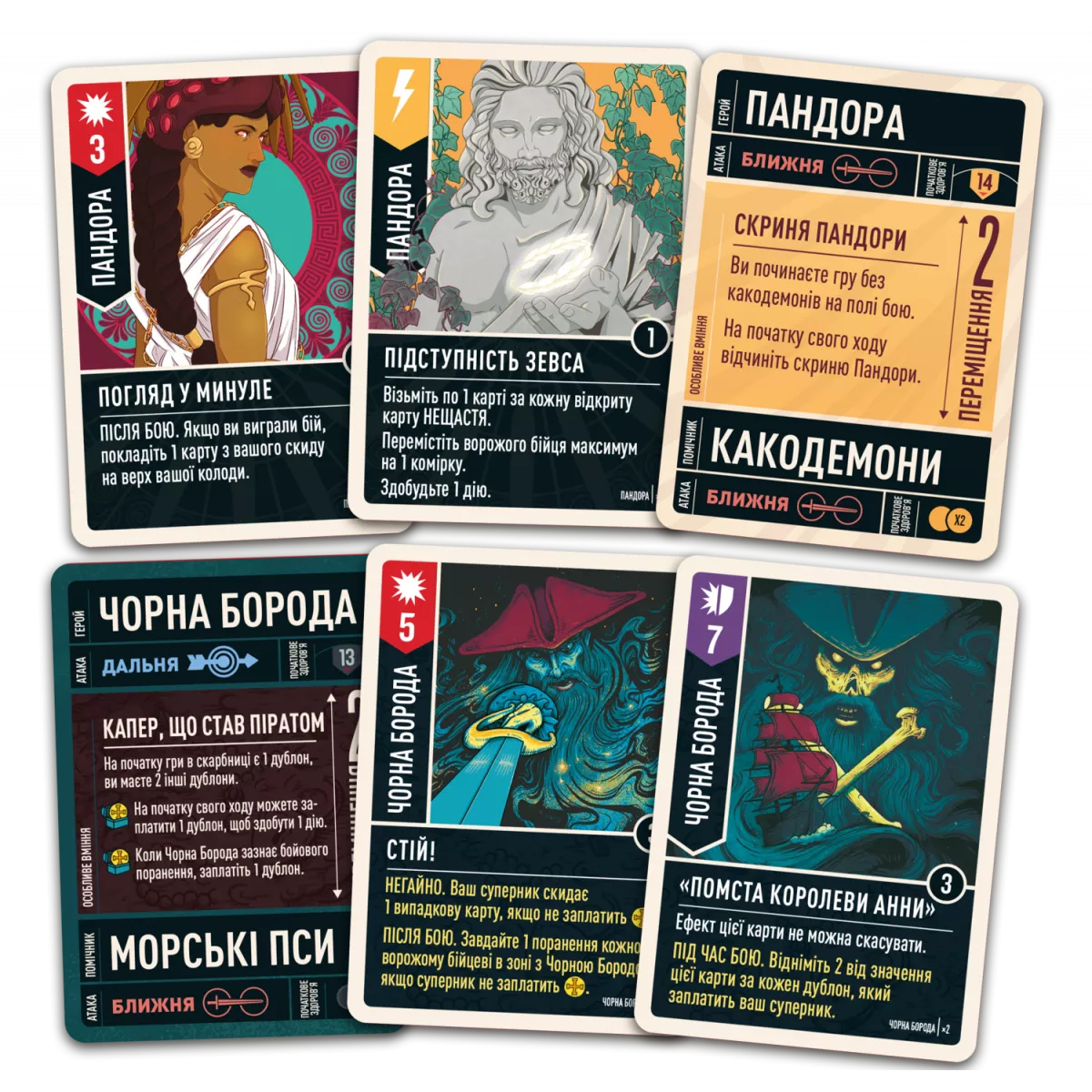 • Пандора. Її серце механіки — «карти нещасть», що працюють за принципом ризику й винагороди. На початку ходу Пандора відкриває верхню карту нещастя й активує ефект, після чого може продовжити відкриття або зупинитися. Чим більше карт відкриєте — тим значніший потенціал ходу, але перевищення порогу пір’їн призведе до поранень. Це герой для тих, хто любить керувати ризиком, планувати серії дій і тримати нерви міцними навіть на межі провалу.