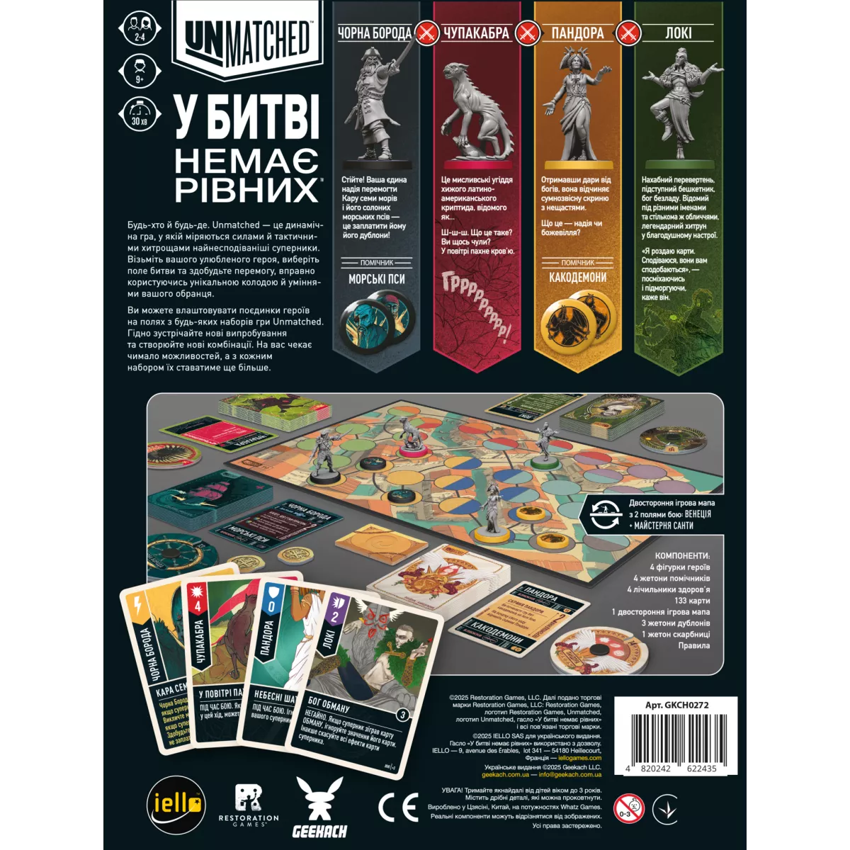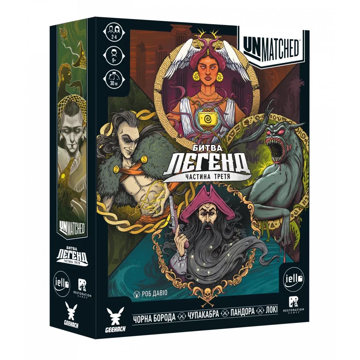 Unmatched: Битва легенд. Частина третя (Volume Three) — автономний набір асиметричних дуелей, що додає до серії чотирьох нових героїв і дві атмосферні арени для тактичних поєдинків. Пандора, Локі, Чорна Борода та Чупакабра приносять абсолютно різні стилі гри, а двостороння мапа з локаціями «Венеція» та «Майстерня Санти» створює нові просторові виклики. Базові правила залишаються простими й динамічними, тож за один вечір ви легко зіграєте кілька партій по 20–40 хвилин. Українське видання зберігає фірмову якість серії, а перший наклад доповнений ефектними фойловими промокартами.
