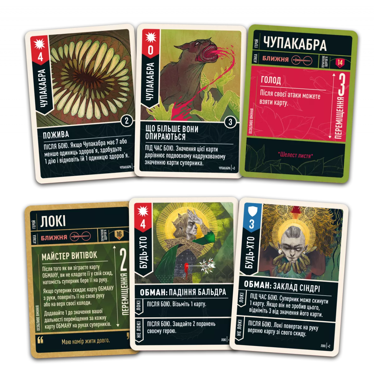 • Локі. Бог-трикстер з колодою «карт обману», які можуть грати обидві сторони, але з різними наслідками. Зіграли карту — вона переходить супернику, і тільки після її застосування потрапляє до вашого скиду. Якщо ж опонент скине карту обману, ви здатні повернути її на руку або на верх колоди. Додатковий бонус — Локі отримує +1 до переміщення за кожну «карту обману» в руці суперника. Це герой для поціновувачів блефу, темпоконтролю й інформаційної переваги.