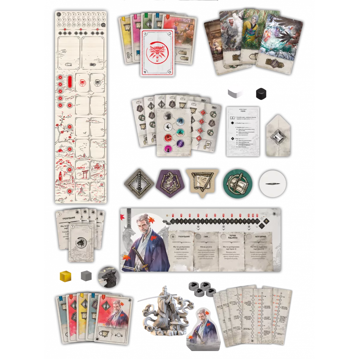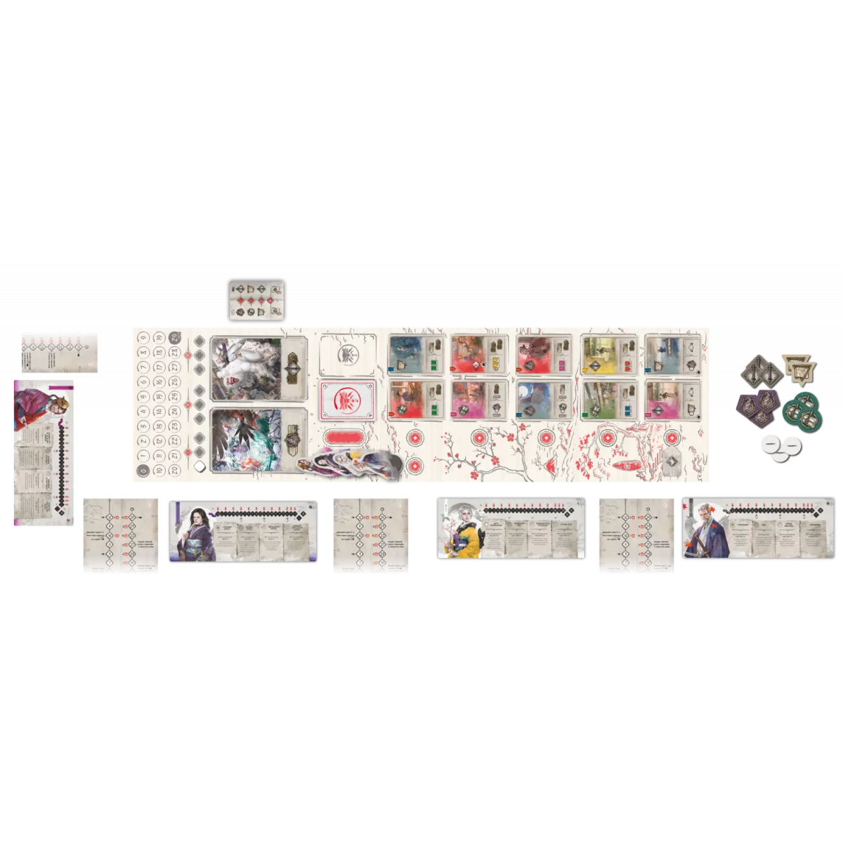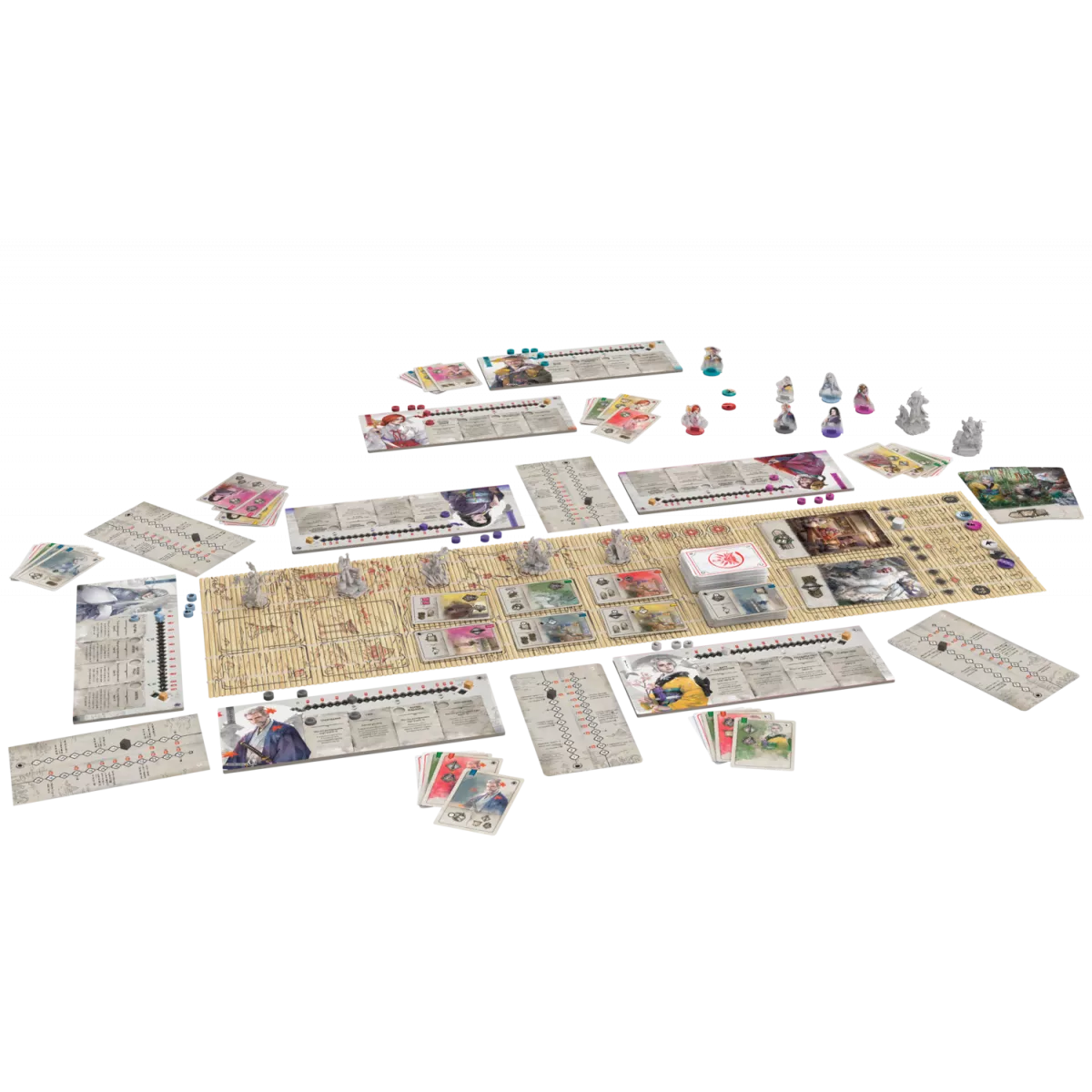 У коробці «бамбукове» ігрове поле, 7 планшетів персонажів, 7 фігурок персонажів, 7 картонних фігурок персонажів, 154 карти, 48 дерев'яних маркерів, 198 жетонів, 5 полів партнерств