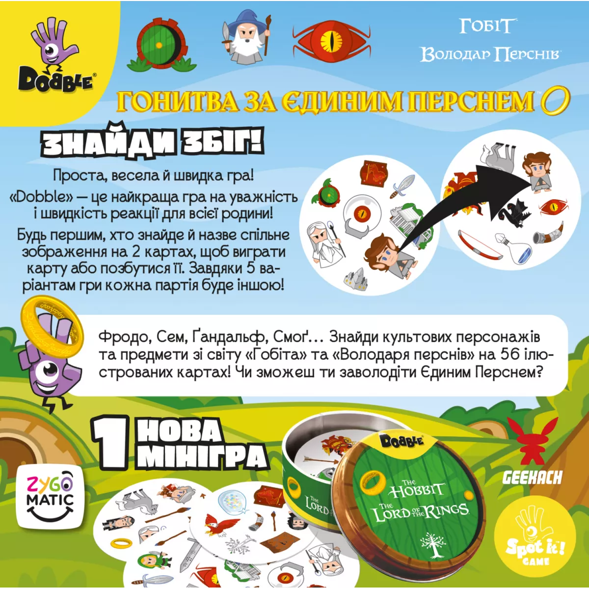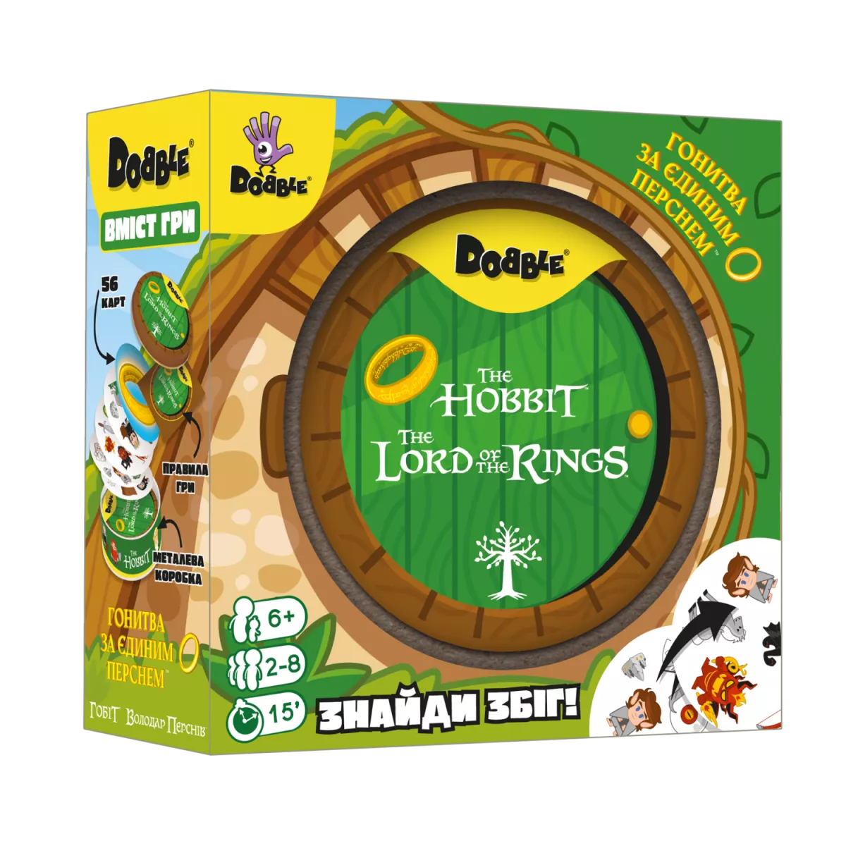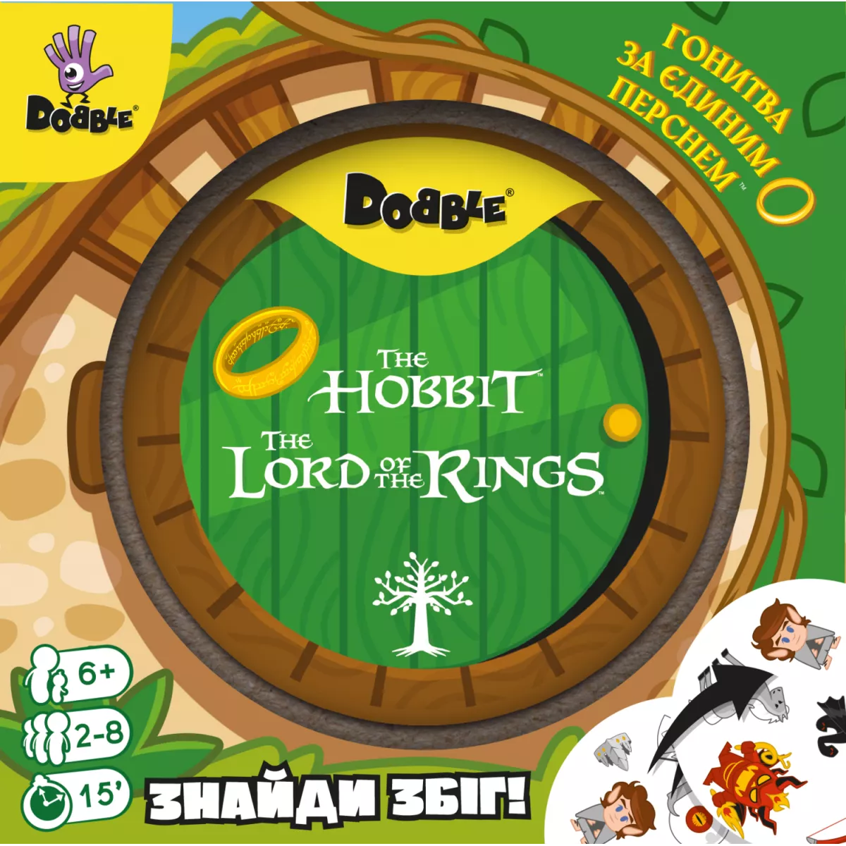 «Доббль Володар Перснів і Гобіт» — тематична версія популярної гри на пошук збігів Dobble, присвячена творам Джона Р. Р. Толкіна. Це проста, швидка й захоплива сімейна гра, що дасть змогу поєднати приємне з корисним — дорослі весело проведуть час, а діти зможуть потренувати свою уважність і швидкість реакції.
