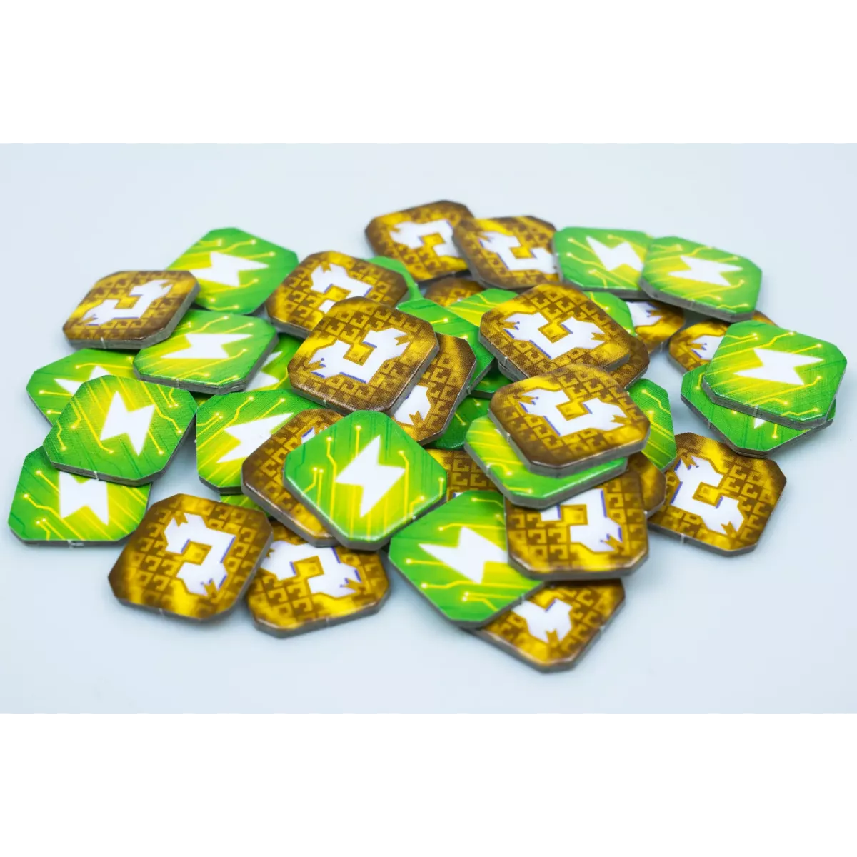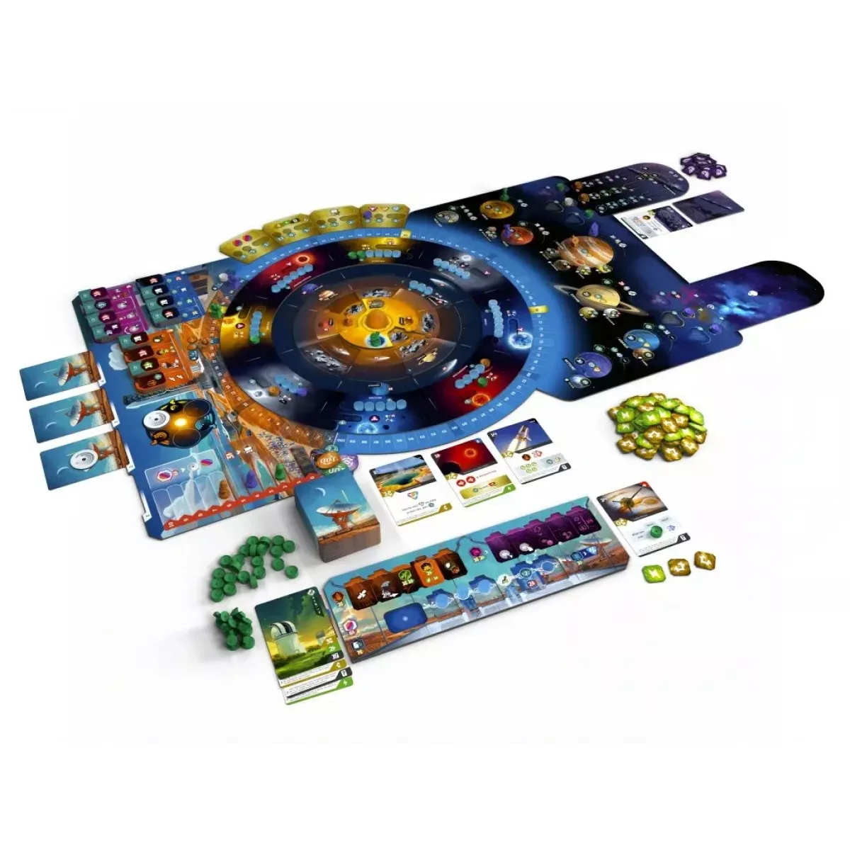 У коробці картонні компоненти -, поле сонячної системи з обертовими дисками, технологічний планшет, планетарний планшет, 4 сектори, 4 двошарові планшети гравців, 5 планшетів з видами прибульців, яких ви можете відкрити, 48 технологічних плиток, 4 двосторонні золоті плитки для підрахунку очок, 60 жетонів кредитів і енергії, 33 жетони і плитки інопланетян, 24 плитки одиночних цілей, інші картонні деталі, 216 карт -, 138 карт проєктів, 4 карти стартового доходу, 55 карт прибульців, 19 карт одиночних дій, 160 дерев'яних компонентів -, 32 фігурки зондів, 120 маркерів гравців, 4 жетони реклами, 4 жетони для підрахунку очок, 71 пластиковий компонент -, 1 сонце, 70 жетонів даних, книга правил і довідкові листи