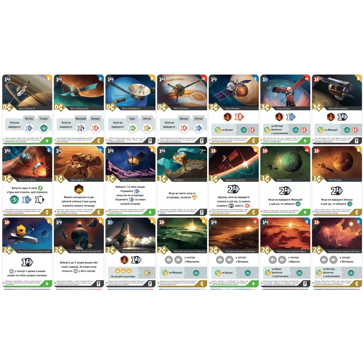 Запускайте зонди для вивчення планет і супутників, спрямовуйте телескопи на далекі зоряні системи та вдосконалюйте обладнання на Землі. Понад 200 карт, що зображують реальні технології та відкриття, допоможуть у ваших дослідженнях.