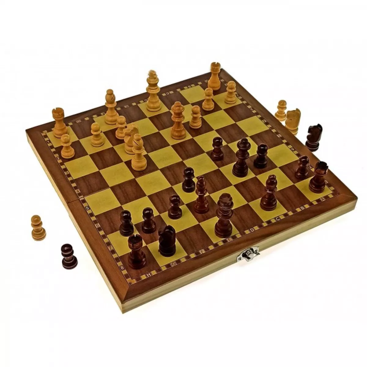 Дерев'яний класичний набір з шаховим полем ззовні, фігурки на магнітах. Кейс з металевим замочком. Розмір – 29 х 29 х 2 см. Довговічний і стильний подарунок.