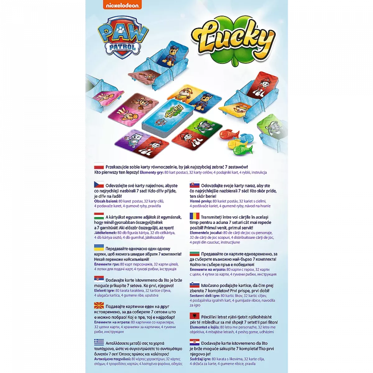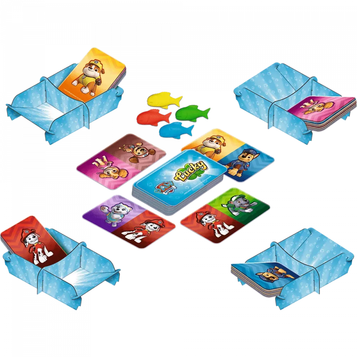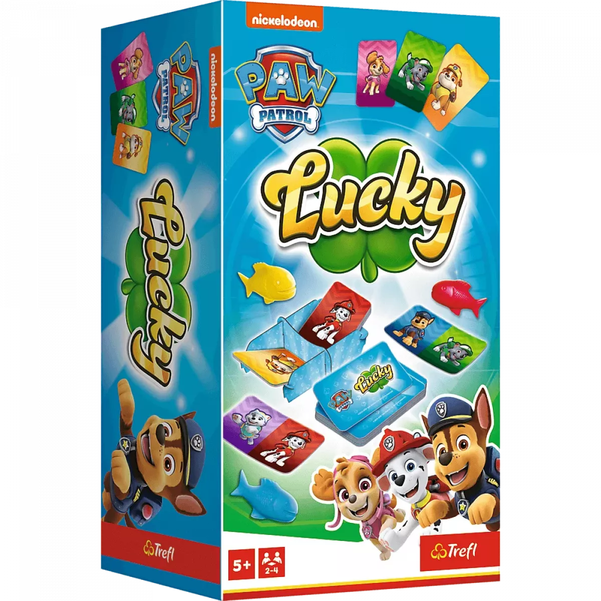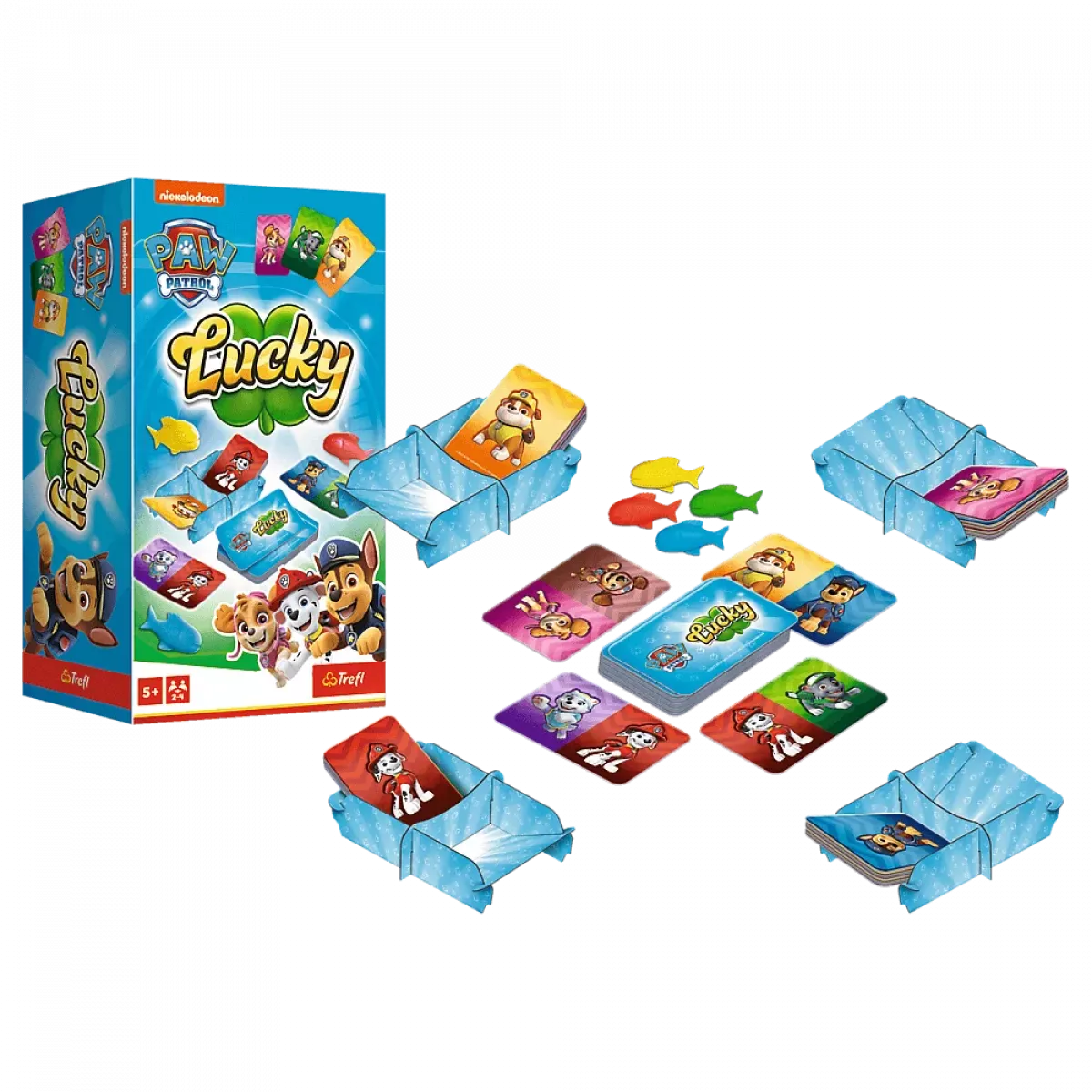 Щеняча місія починається: хто стане головним героєм? У величезному місті пригод щодня щось відбувається, і хто, як не герої зі «Щенячого патруля», завжди готові допомогти! Настільна гра Щенячий патруль: Щасливчик (Lucky Paw Patrol) переносить вас до центру захопливих місій, де кожен гравець приміряє роль одного з улюблених персонажів. У наборі ви знайдете 80 карт із зображеннями цуценят та їх помічників, які допоможуть вам на шляху до перемоги. Підготуйте свої 4 лотки для подачі карток і візьміть до рук гумові рибки – з їх допомогою удача точно опиниться на вашому боці! Кожен хід – це крок до збирання унікальної колекції з 7 карт-цілей, а час тут грає проти вас! Швидкість реакції, стратегічне мислення та крапелька везіння допоможуть стати справжнім героєм Щенячого патруля. Чи готові до старту?