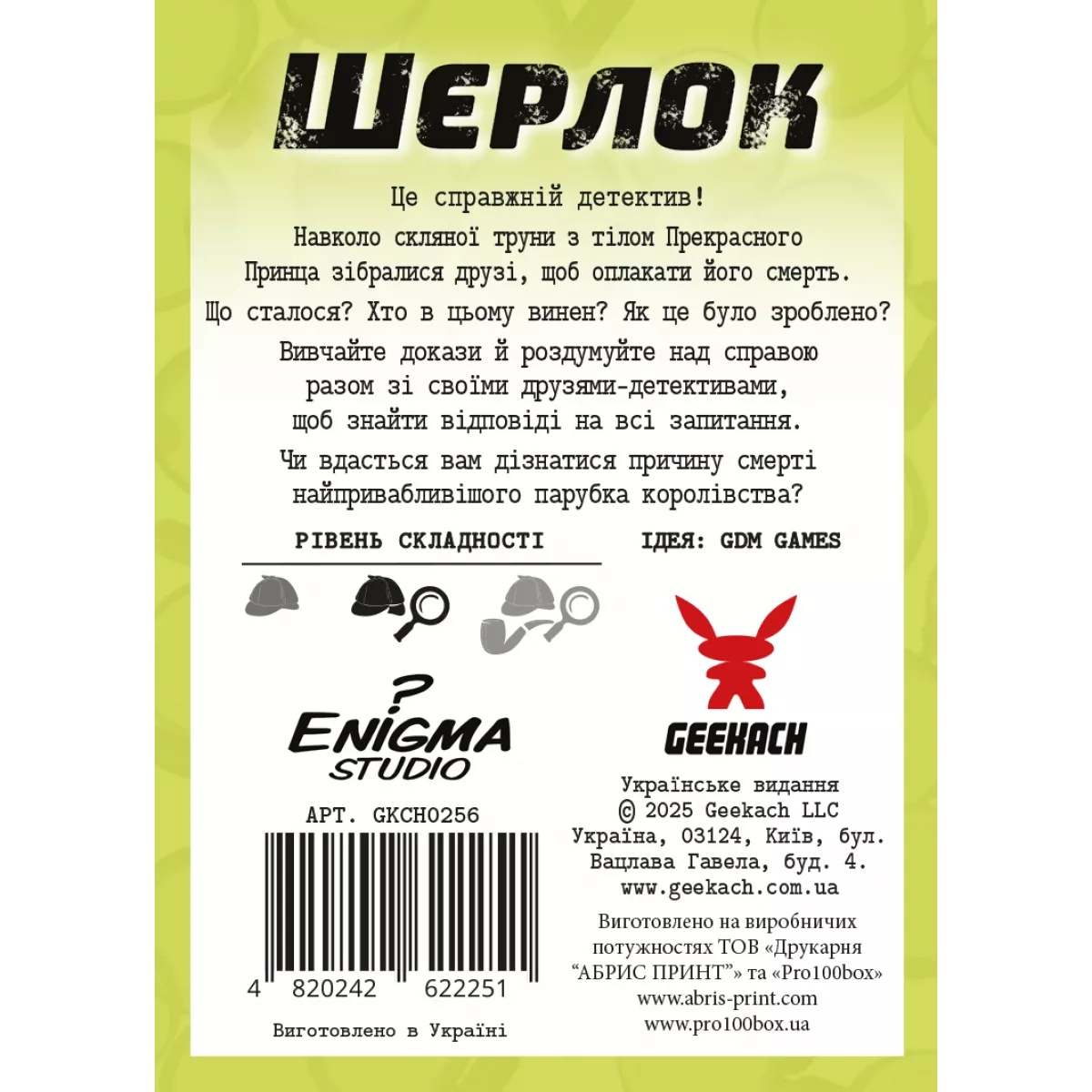«Шерлок» — серія швидких карткових детективів, де в кожній коробочці на вас чекає окрема справа. Разом з друзями або самостійно ви розслідуєте загадкову подію, спираючись на пролог та 32 карти-підказки. Це справжній інтелектуальний виклик, адже вам потрібно буде поєднати всі уривки інформації, серед яких є і неправдиві, в єдину картину подій.