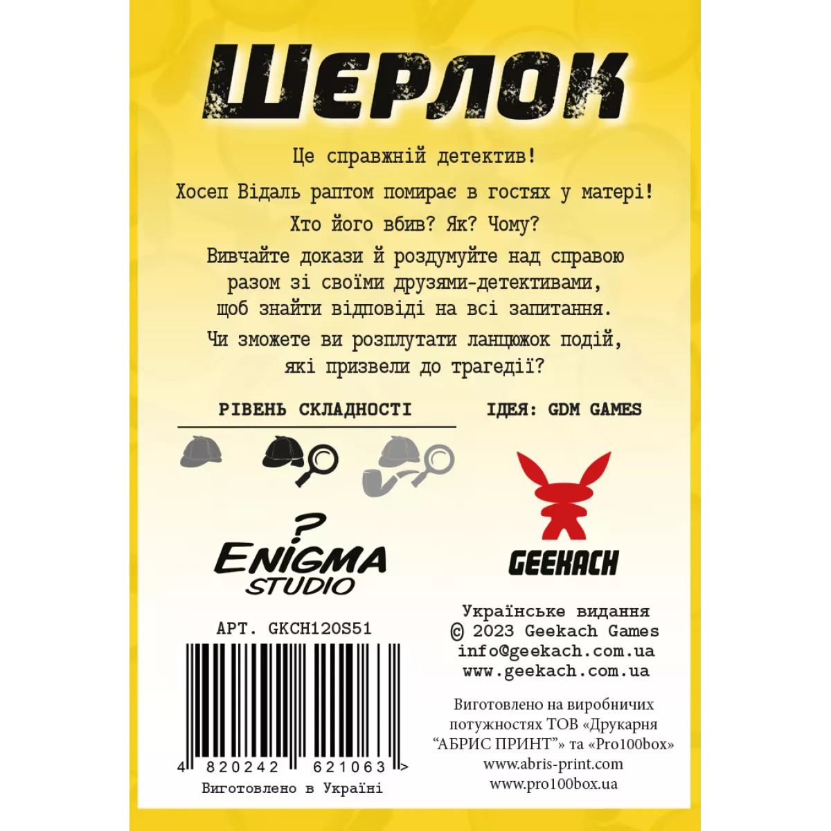 «Sherlock» (також відома як «Елементарно») – популярна серія швидких детективних кооперативів для 1-8 гравців. У 2019 році ця гра стала номінантом престижного конкурсу «Spiel des Jahres» (Гра року в Німеччині). У кожній коробочці гравців чекає окрема справа. Це цікавий детективний філлер, який можна розслідувати соло, з друзями або членами сім’ї. Joy гарантує, що гра сподобається як новачкам, так і досвідченим гравцям.