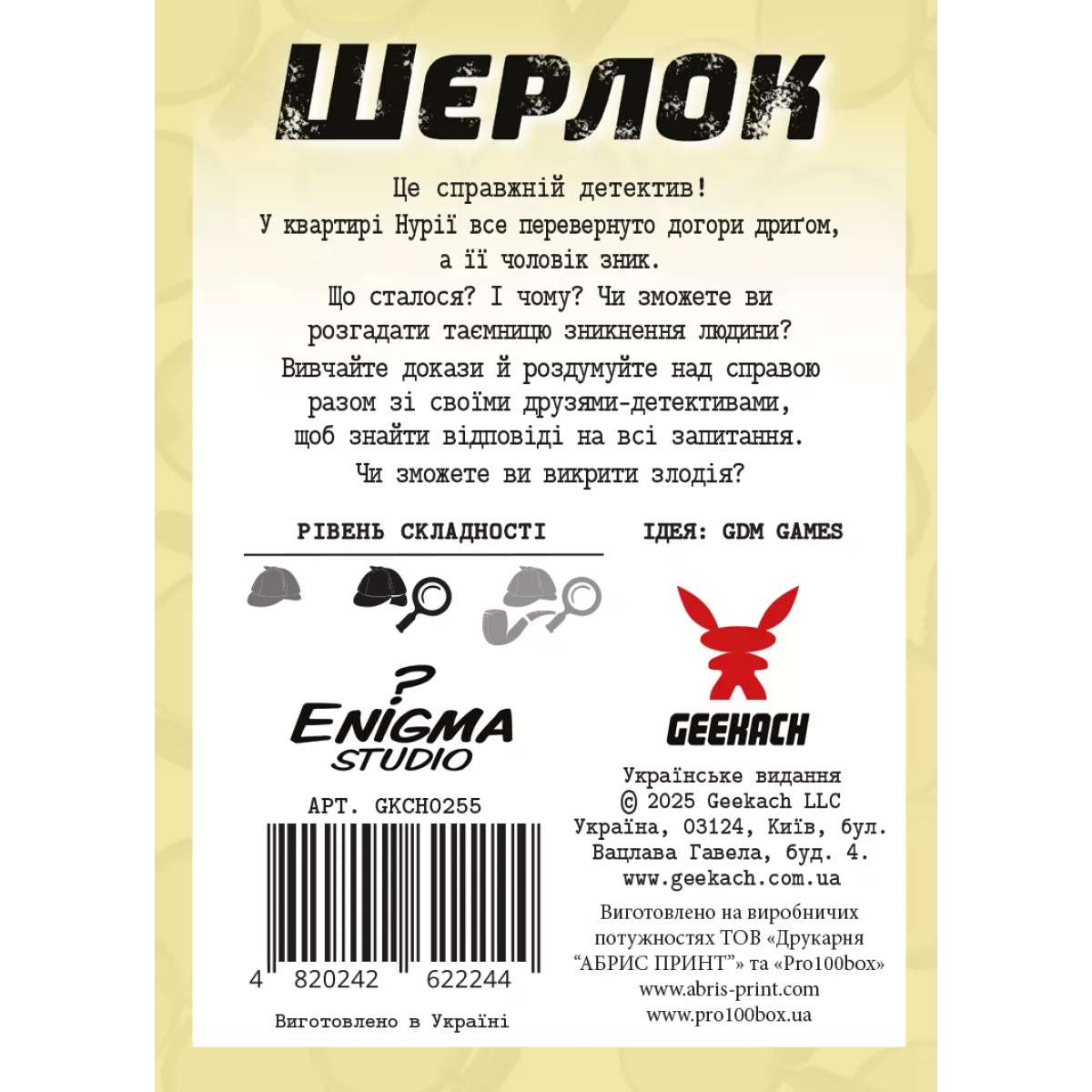 «Шерлок» — популярна серія кишенькових детективних ігор для компанії або соло-розслідування. Кожен випуск пропонує окрему історію з власними таємницями. Гравці поступово відкривають підказки, ведуть жваві обговорення та разом складають повну картину подій.