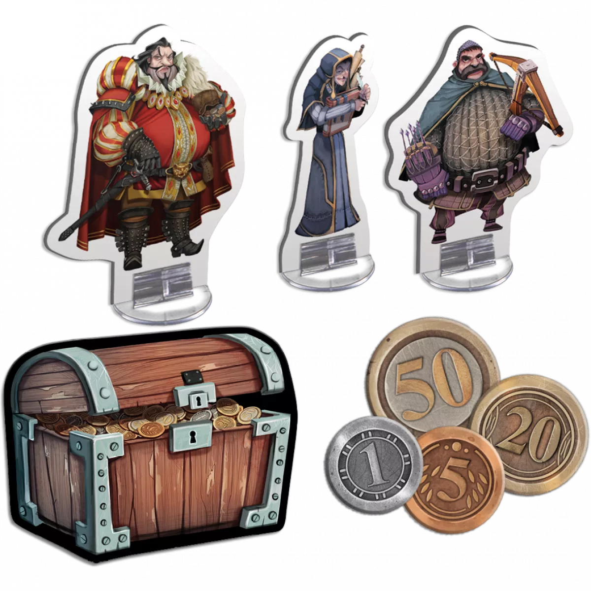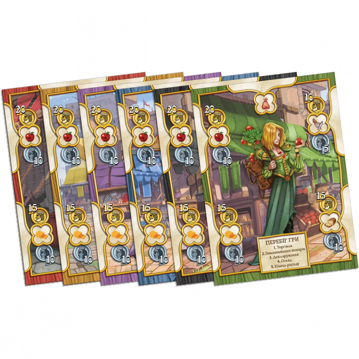 У коробці 204 карти товарів, 144 легальних товарів, 60 контрабандних товарів, 12 карт королівських товарів, 6 карт помічників, 6 карт чорного ринку, 133 золотих монети, 1 стенд шерифа, 2 стенди помічників, тайл багатства (скриня), 6 стендів торговців, 6 мішечків торговців, правила​