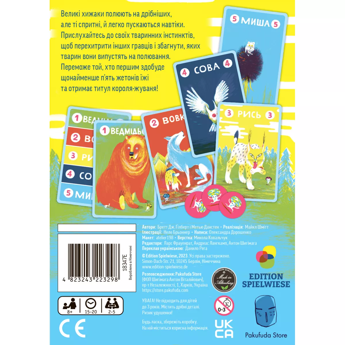 Великі хижаки полюють на дрібніших тварин, утім ті спритні й можуть легко накивати п’ятами. Використайте свої тваринні інстинкти, щоб перехитрити інших гравців і вгадати, яких тварин вони відправлять на полювання. Перший гравець, який здобуде п’ять жетонів їжі, отримає звання короля-жуваня!