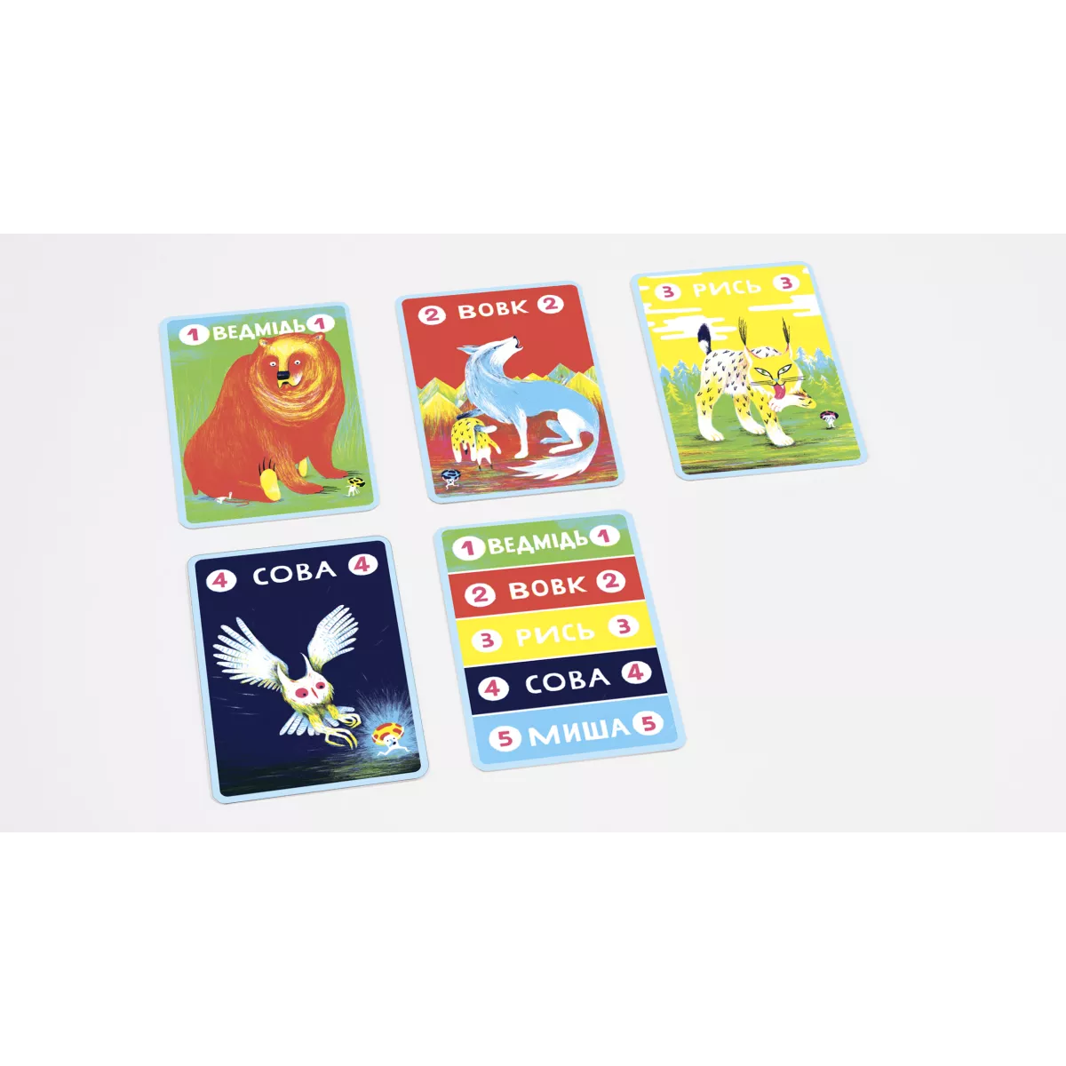 У коробці 25 карток із тваринами, розділених на 5 наборів по 5 карток - 1 ведмідь, 1 вовк, 1 рись, 1 сова та 1 миша, 25 фішок для їжі, 5 оглядових карток, 1 гайд із правилами