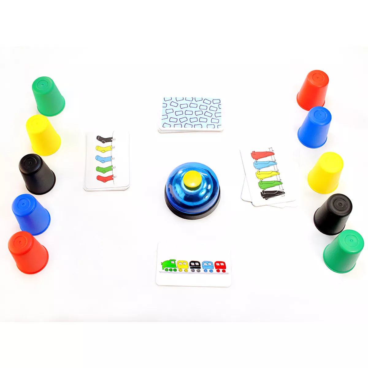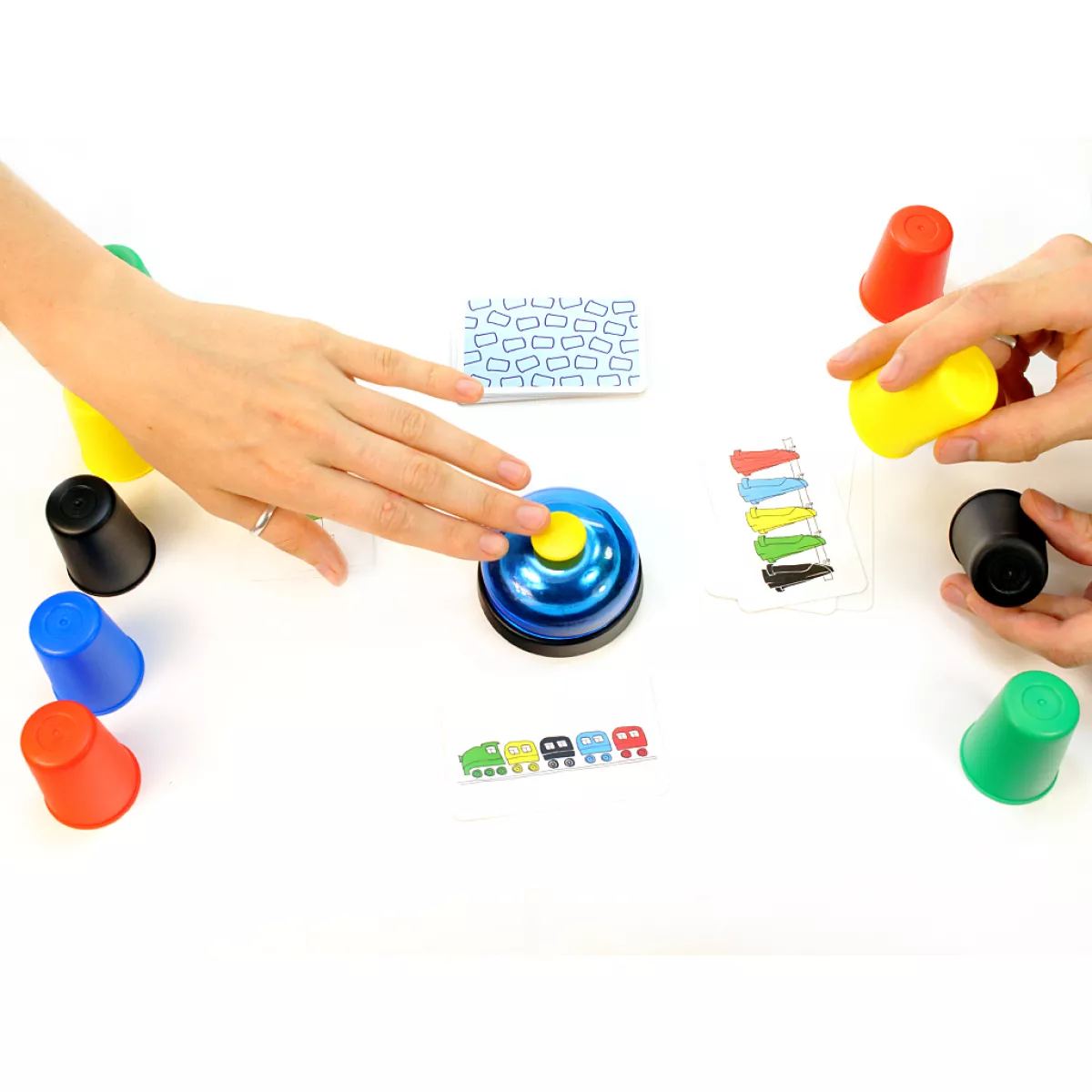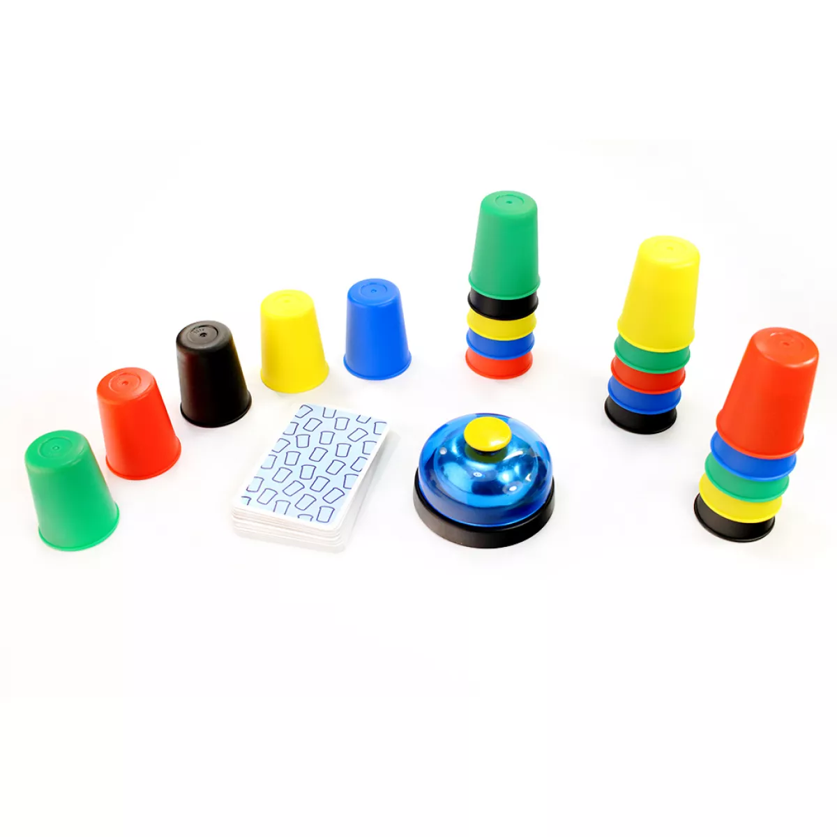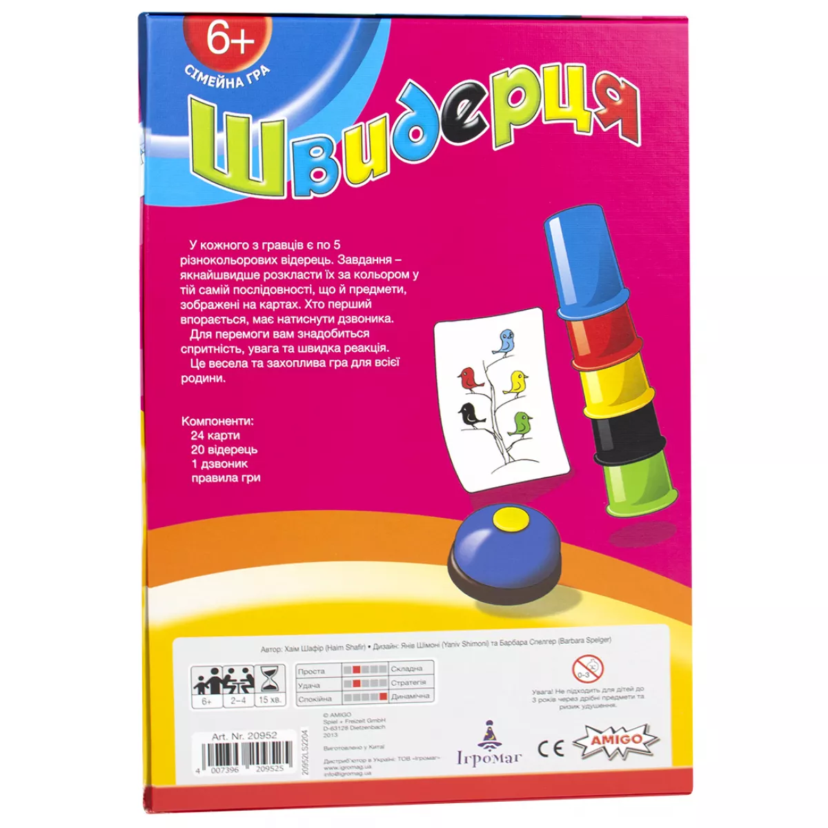 Звичайні пластикові стаканчики можуть творити справді чудеса. Звісно ж, якщо вони різнокольорові. Так набагато веселіше та цікавіше за ними спостерігати. Якщо вам дати декілька завдань із цими стаканчиками, які потрібно виконувати на швидкість ‒ ви точно добре проведете час та не матимете навіть змоги занудьгувати. І все просто через те, що вам потрібно створити правильну послідовність. Настільна гра Швидерця (Speed Cups) пропонує вам позмагатися у спритності. Побачимо, хто з вас зможе швидше за інших зорієнтуватися в ситуації. У когось точно вийде гарна пірамідка зі стаканчиків У приємній на вигляд і неймовірно яскравій коробочці ви знайдете невеличку колоду карток, 4 набори пластикових стаканчиків-ковпачків, дзвіночок і правила до гри. Кожен учасник на початку партії отримує свій набір ковпачків ‒ усього їх він матиме 5: жовтий, синій, чорний, червоний і зелений. Коли всі учасники готові, можна розпочинати гру. Ретельно перетасуйте колоду, що складається із 24 карток. Відкрийте верхню, після чого одразу ж починайте грати. Ваше завдання ‒ розташувати ковпачки точно в такому ж самому порядку, що й на картинці. Очевидно, що там не будуть зображені просто стаканчики ‒ це може бути вішак із капелюшками, гусениця, морозиво, декілька повітряних кульок чи багато чого іншого. Кожен елемент на малюнку замальований в один із п'яти кольорів, що відповідають вашим стаканчикам. Малюнки змусять вас розташовувати стаканчики горизонтально або вертикально ‒ це вже як яка картка скаже. У першому випадку досить поставити їх у ряд у правильній послідовності, у другому ‒ розмістити ковпачки одне на одного. Перший, хто впорається із завданням, має подзвонити у дзвіночок, таким чином показавши, що він уже готовий. Перевірте, чи все він правильно зробив. Якщо все вийшло як треба, цей гравець отримує картку як переможний бал, після чого можете розпочинати новий раунд. Якщо ж цей гравець помилився, продовжуйте розставляти стаканчики, поки хтось знову не скаже, що готовий. Партія закінчується, коли в колоді більше не залишається карток. Хто назбирає їх найбільше, той і перемагає у грі. Бавимося ковпачками як справжні фокусники Швидерця (Speed Cups) можна назвати неймовірно динамічною настільною грою, де найважливіше вміння ‒ моментально реагувати на картинку та викладати свої стаканчики у правильній послідовності. У кожного учасника прокинеться неабиякий азарт, адже всім хочеться бути першими.