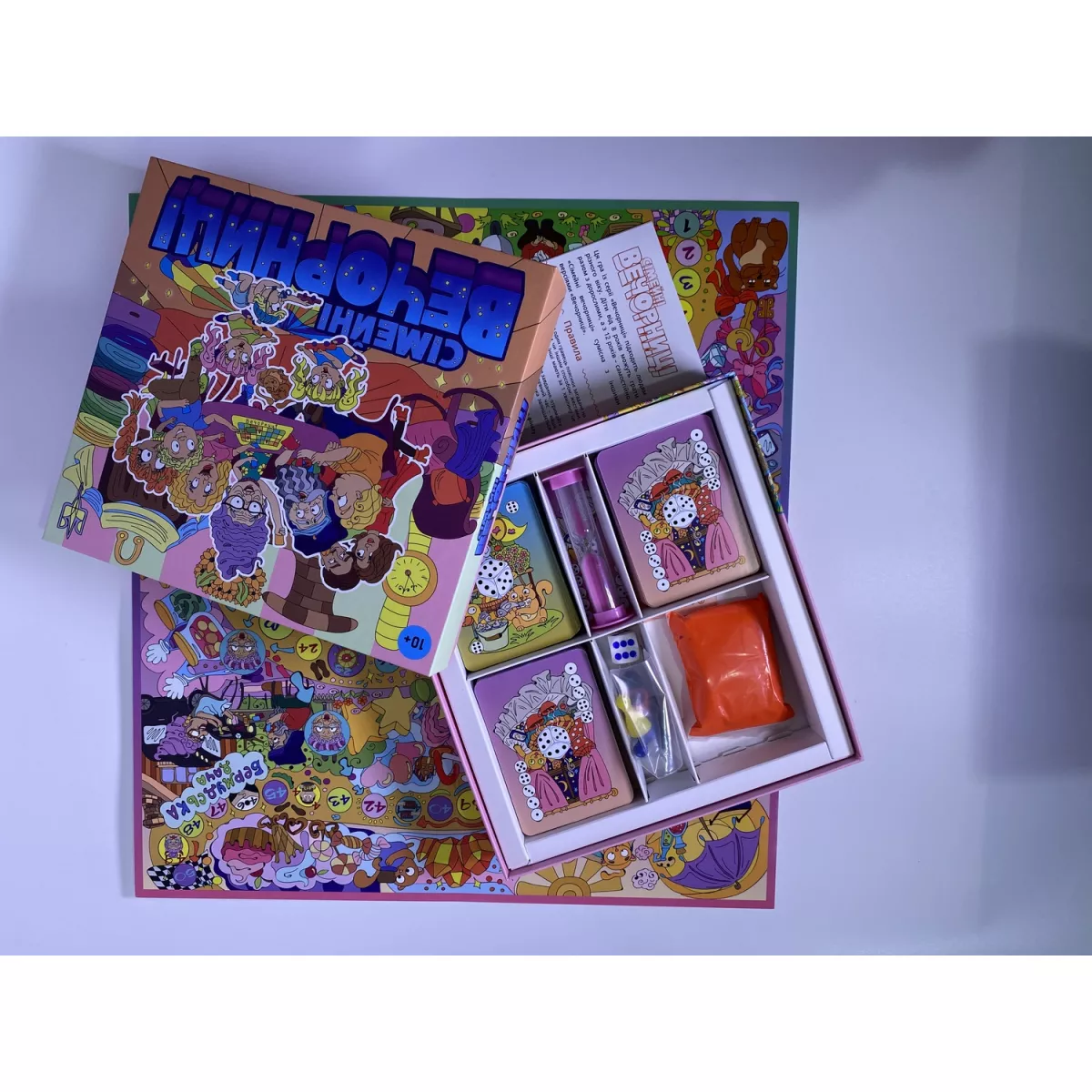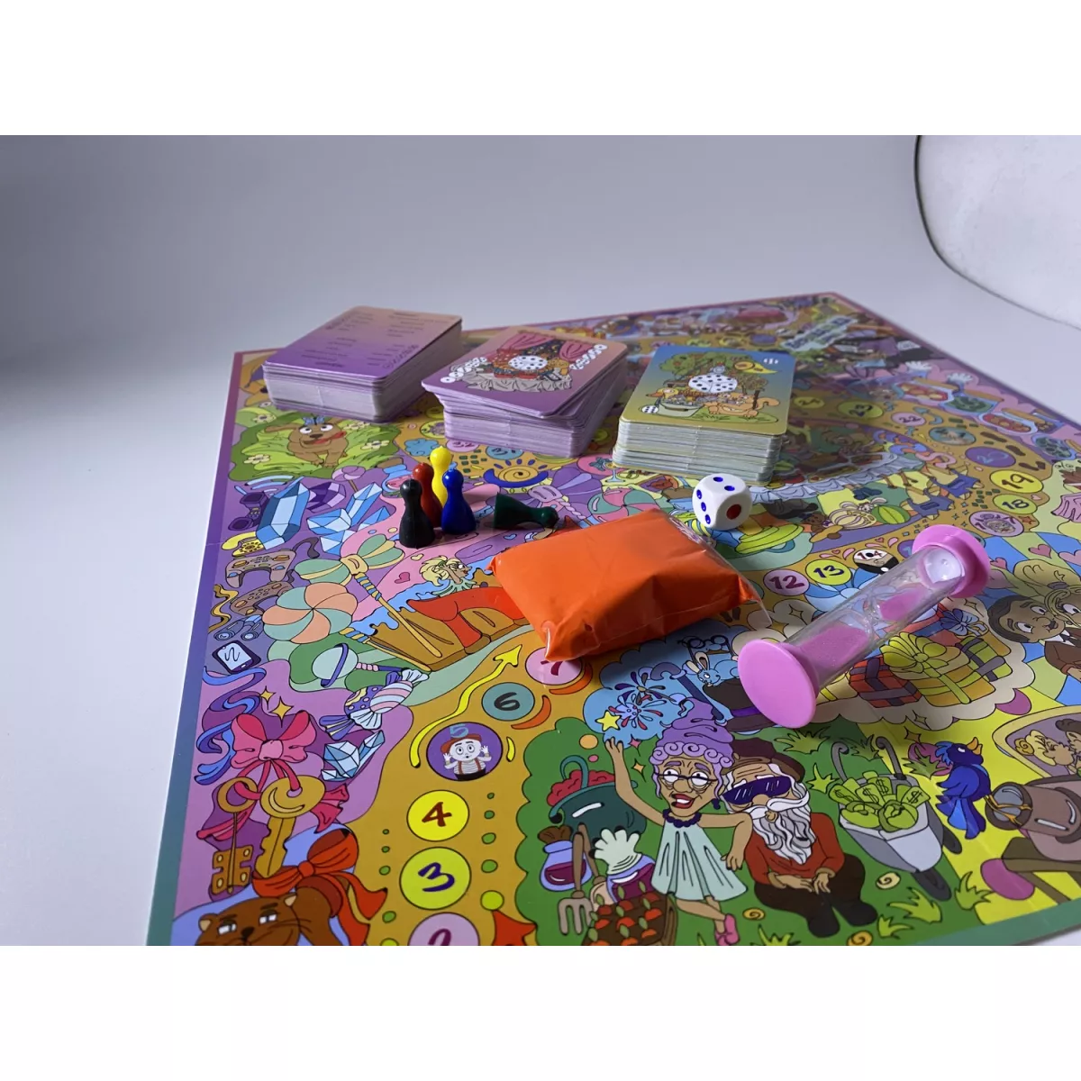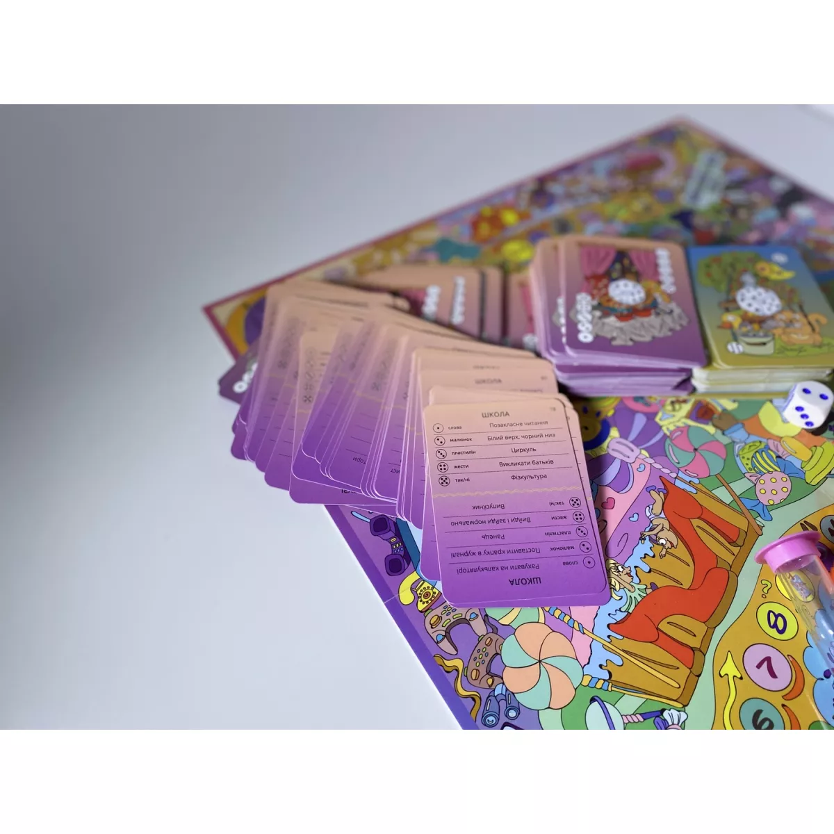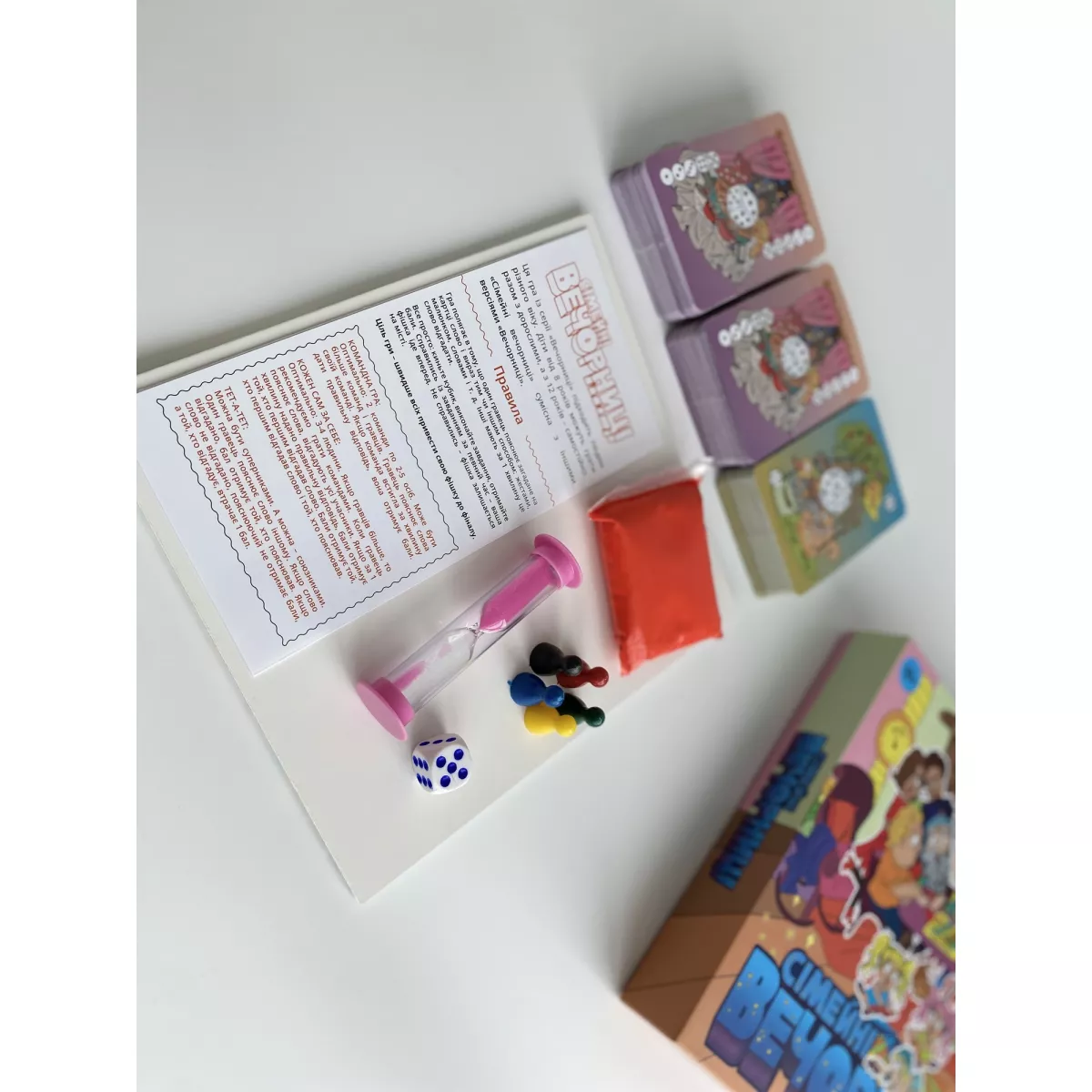 У коробці 180 карток, гральне поле, кубик, 5 фішок, пластилін, пісковий годинник , правила гри