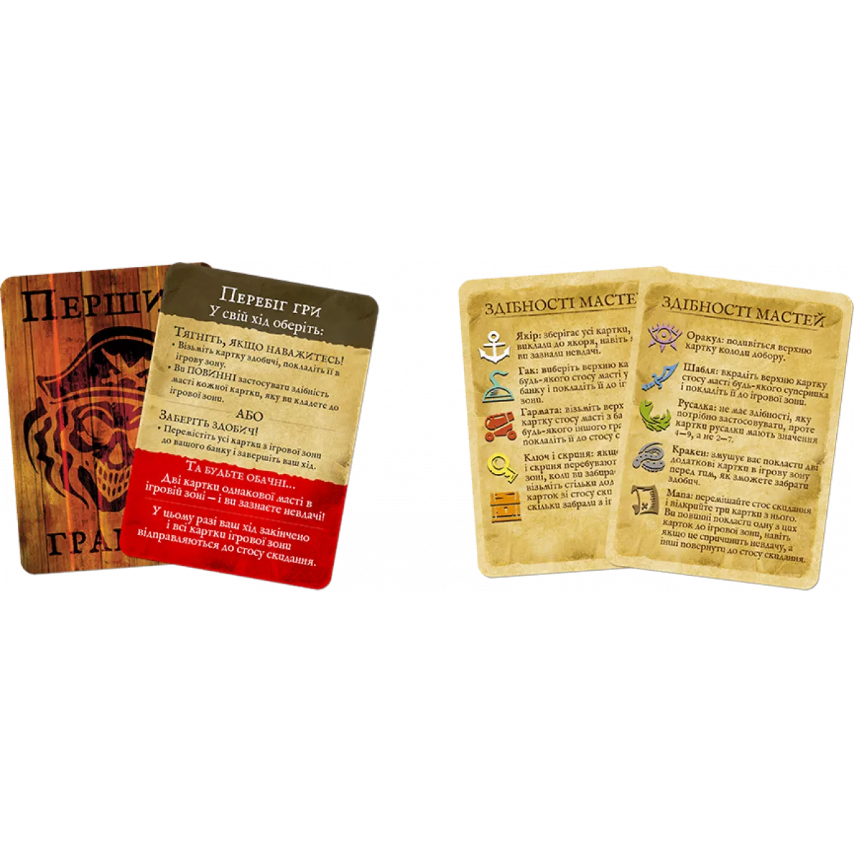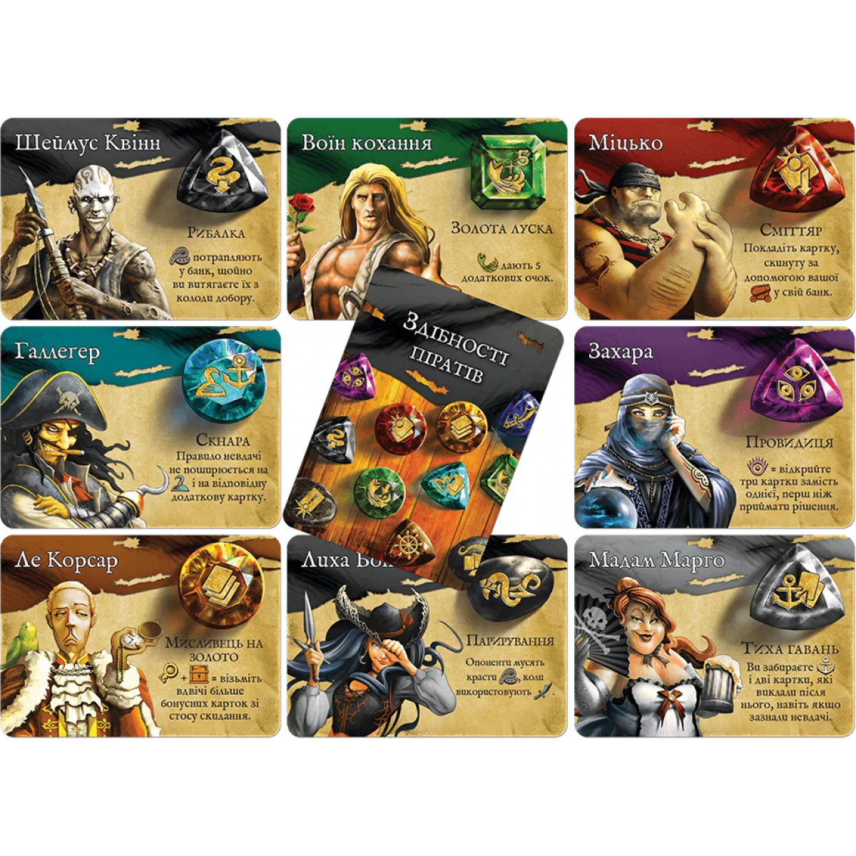 • Різноманітність: Включає картки здобичі, 17 карток піратських здібностей та 6 варіантів гри, що забезпечують високу реіграбельність.